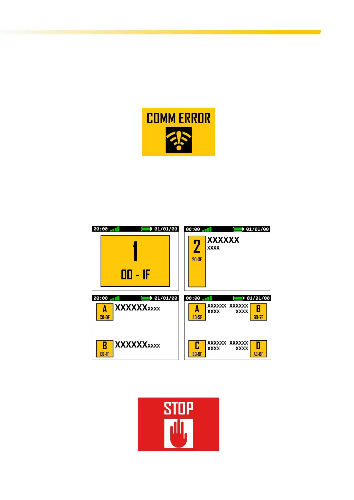 The STOP screen is displayed whenever the Transmitter is in STOP mode. This can be achieved when in Active (User manually activates