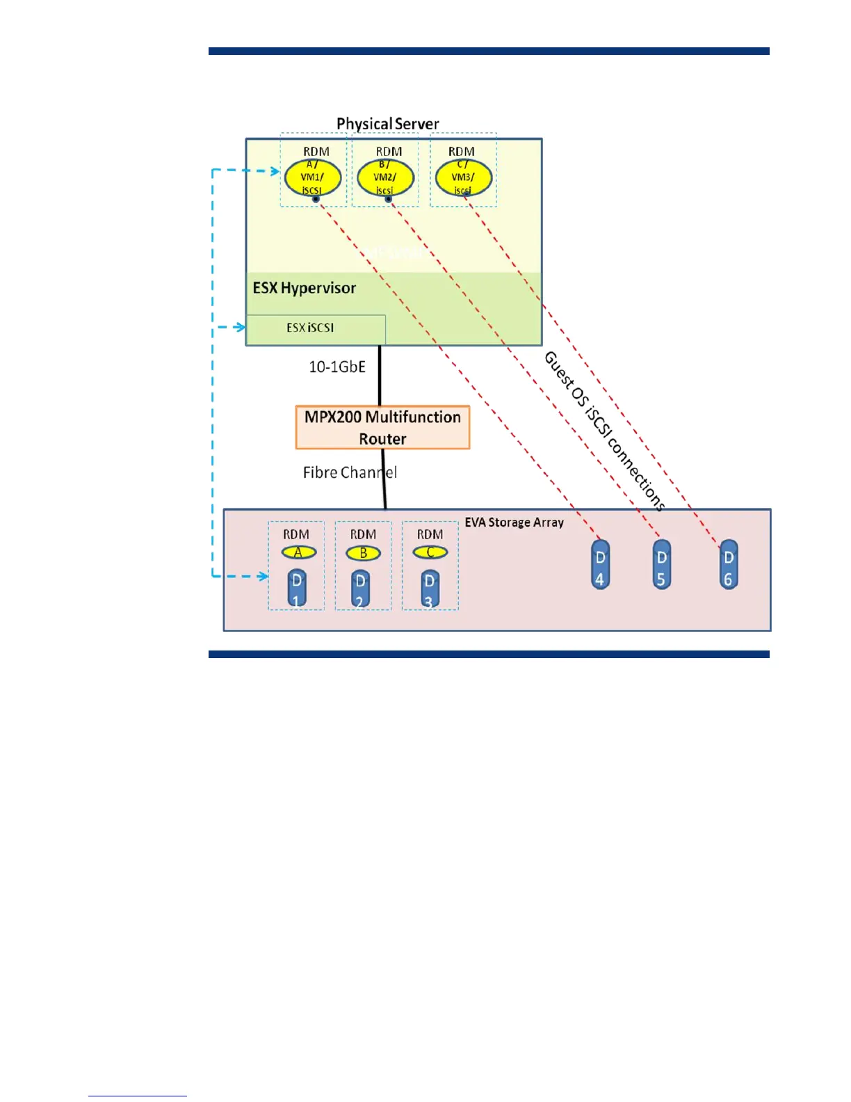MPX200. The Vdisk D4 is presented to the iSCSI initiator in VM1, Vdisk D5 is presented to the