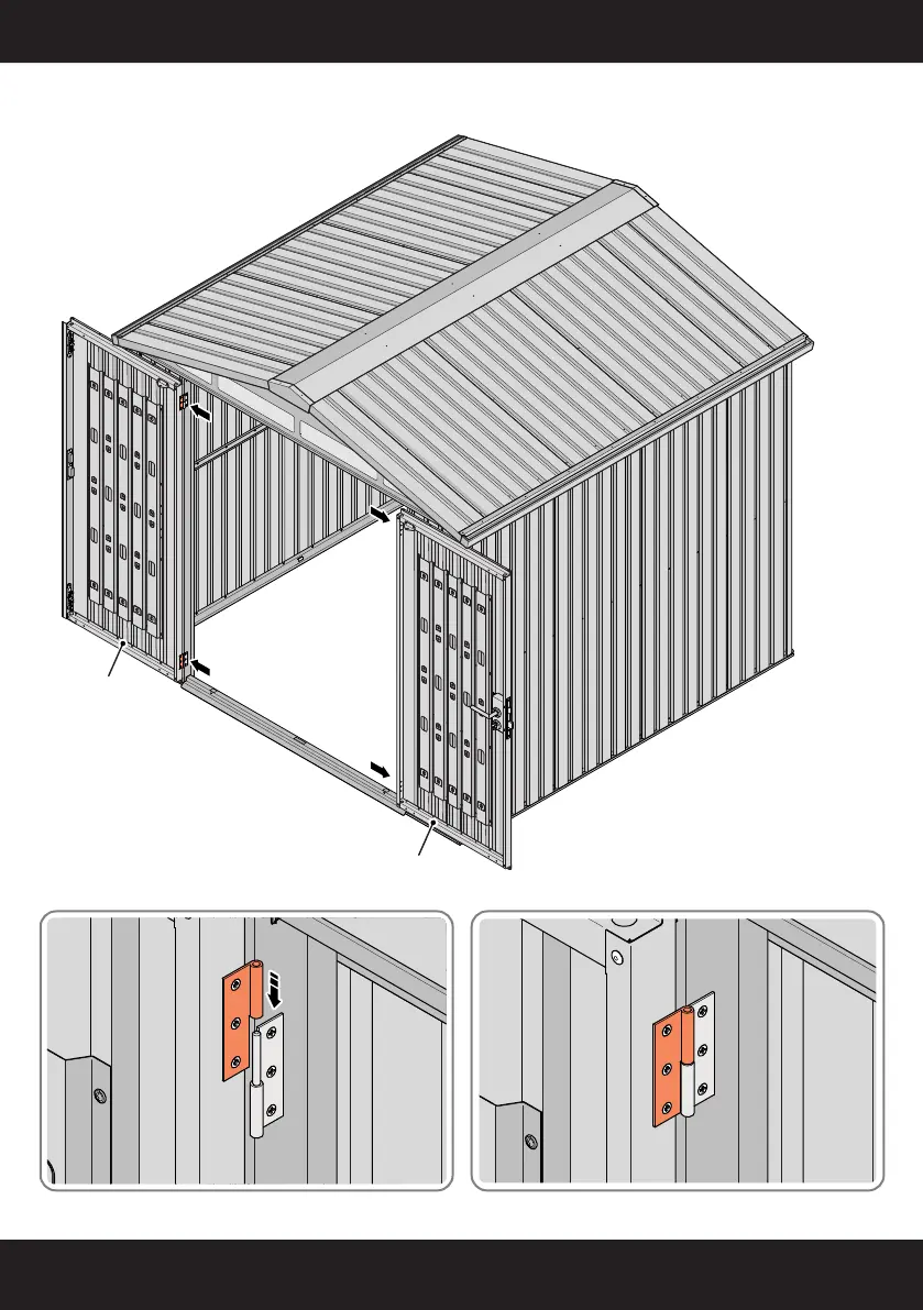 ASSEMBLED DOOR HINGE.SLIDE EACH DOOR ASSEMBLY ONTO EACH OF THEIR RESPECTIVE HINGES.