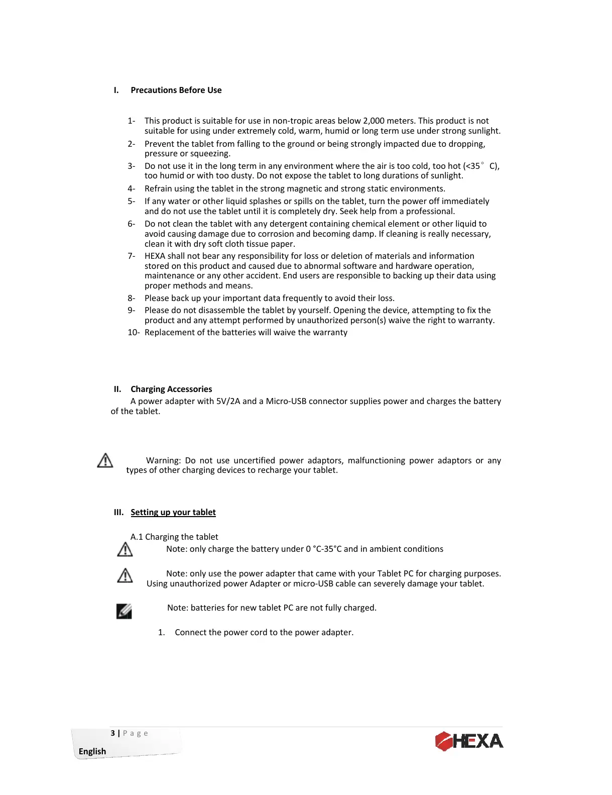 HEXA Spring 8 - Precautions Before Use; Charging Accessories; Setting Up your Tablet; Charging the tablet