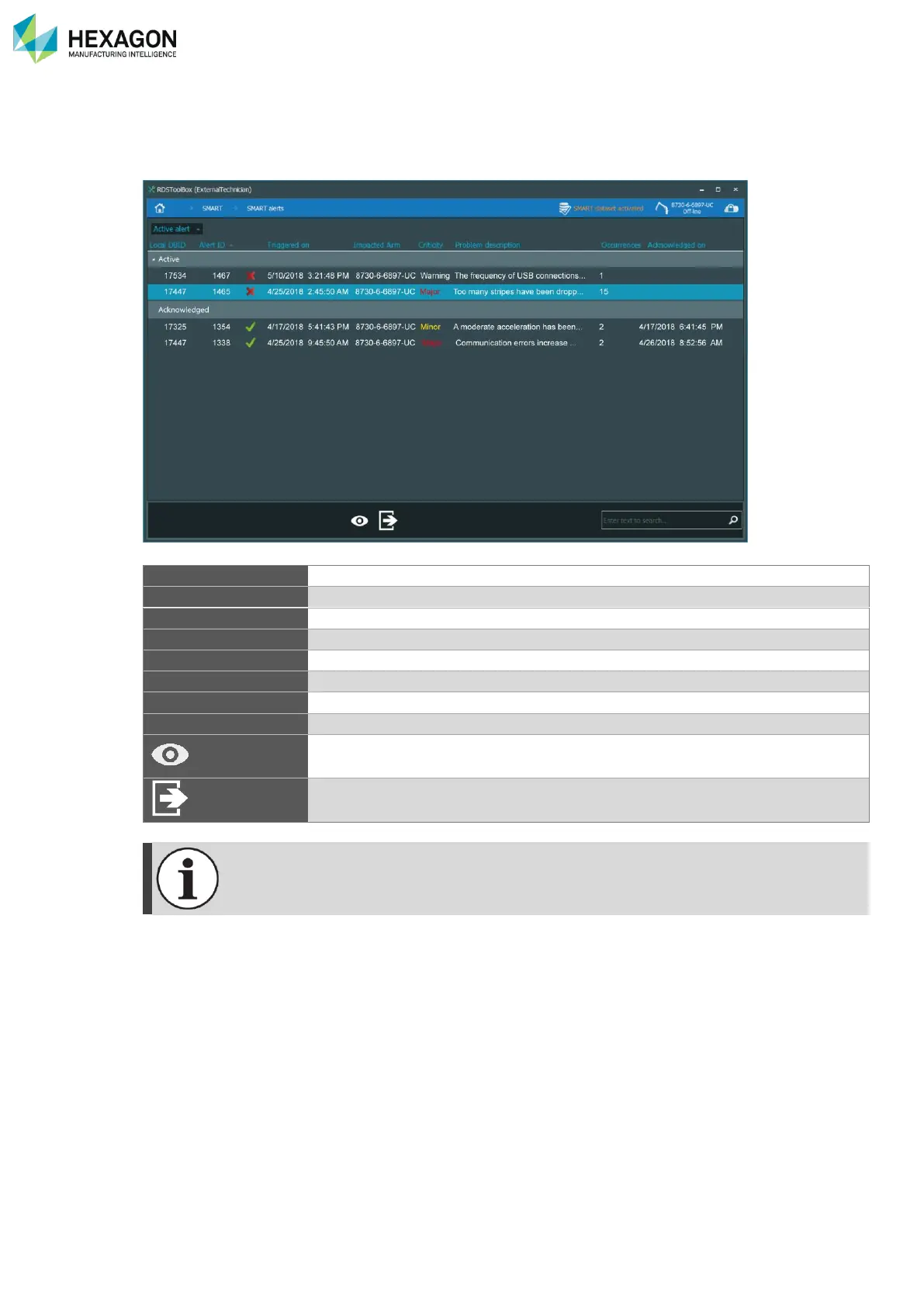 By opening on a notification or through RDS Toolbox > SMART > Display alerts (and select the arm), the