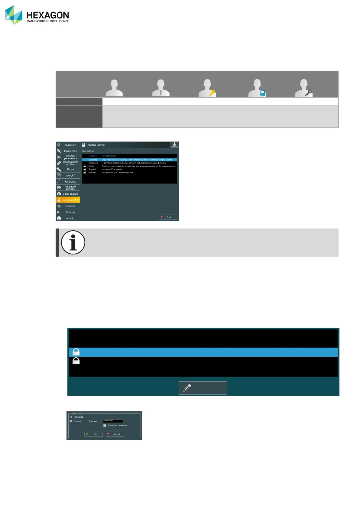 Except the Standard profile, the access to the user profiles is protected by a password and/or a Feature