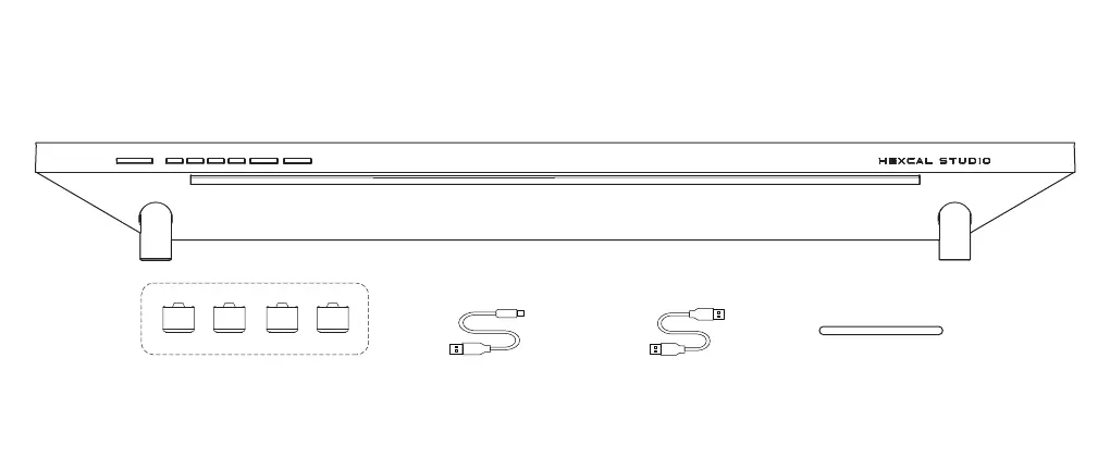 HEXCAL STUDIO - In the Box Contents; Included Components Overview; Hidden Extension Feet Details; Cables and Straps Information