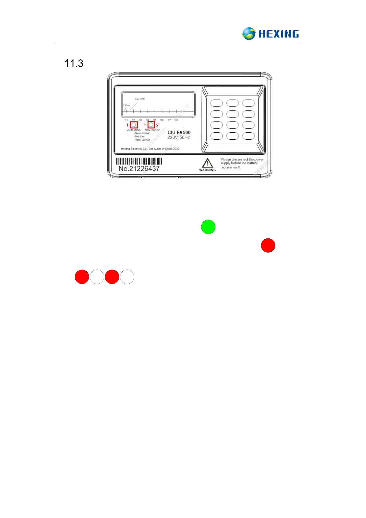 ⚫ Credit Balance less than alarm value level 2: LED in red and flashing