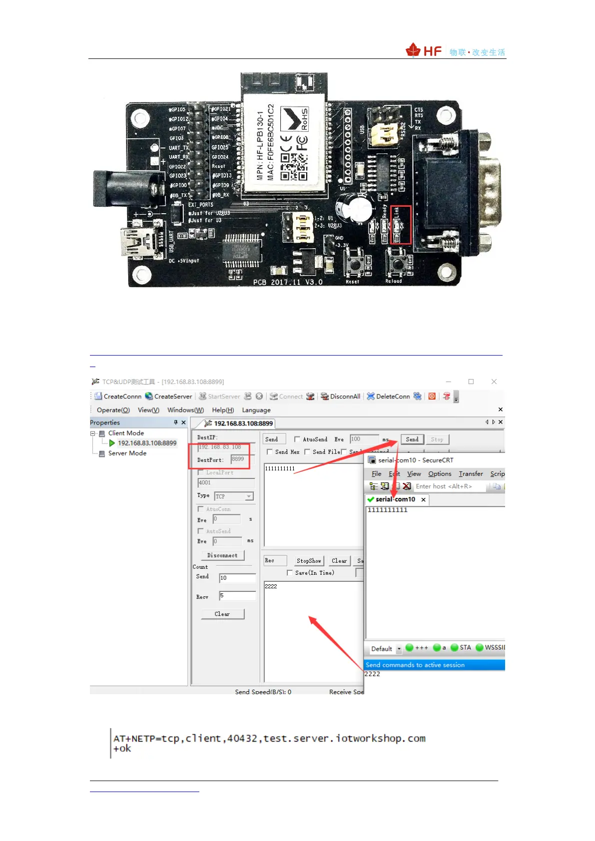 Modify AT+NETP as a TCP client, perform client test, and test using High Flying test