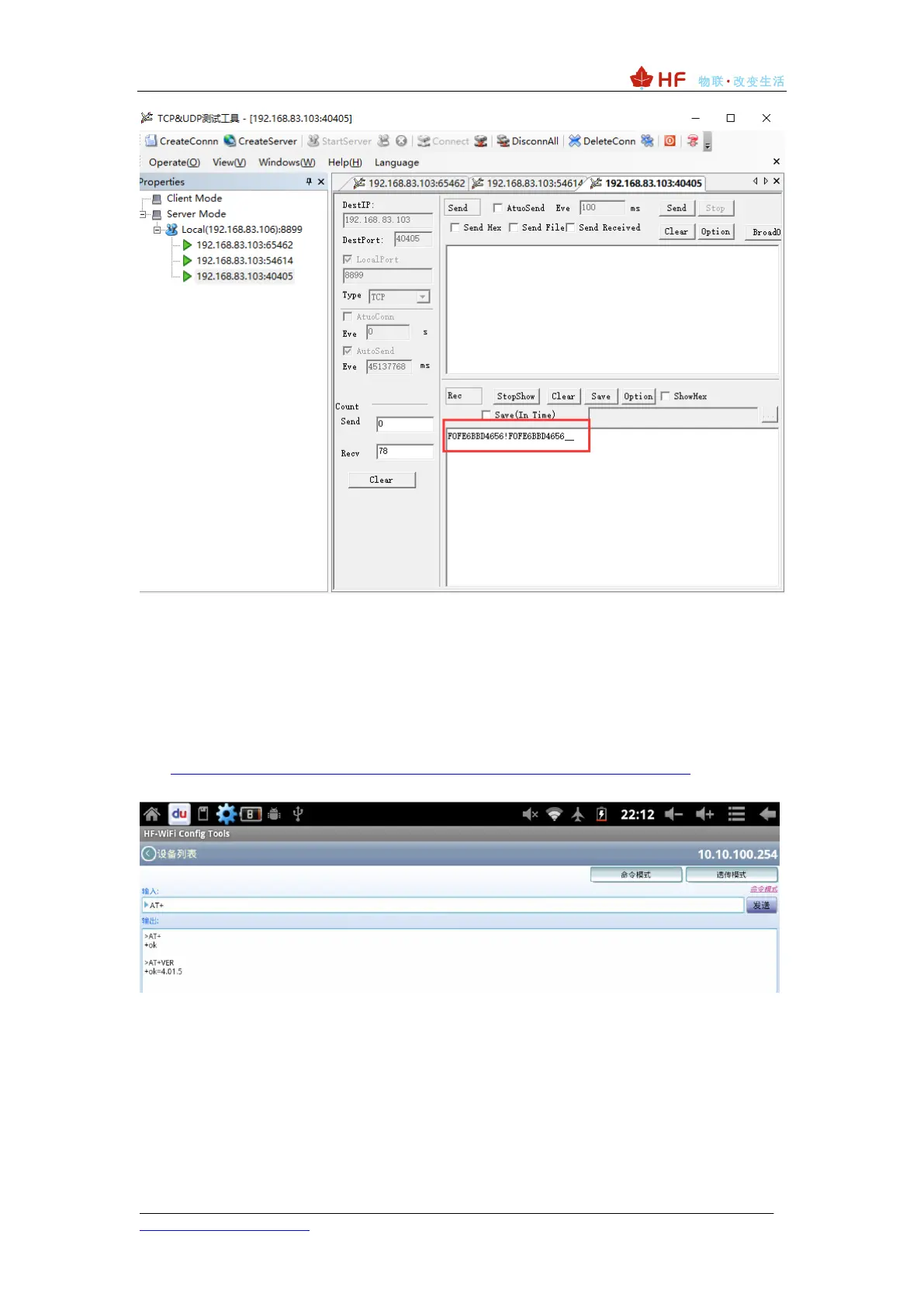 connected to the same router, the AT command can be sent through the network. For details,