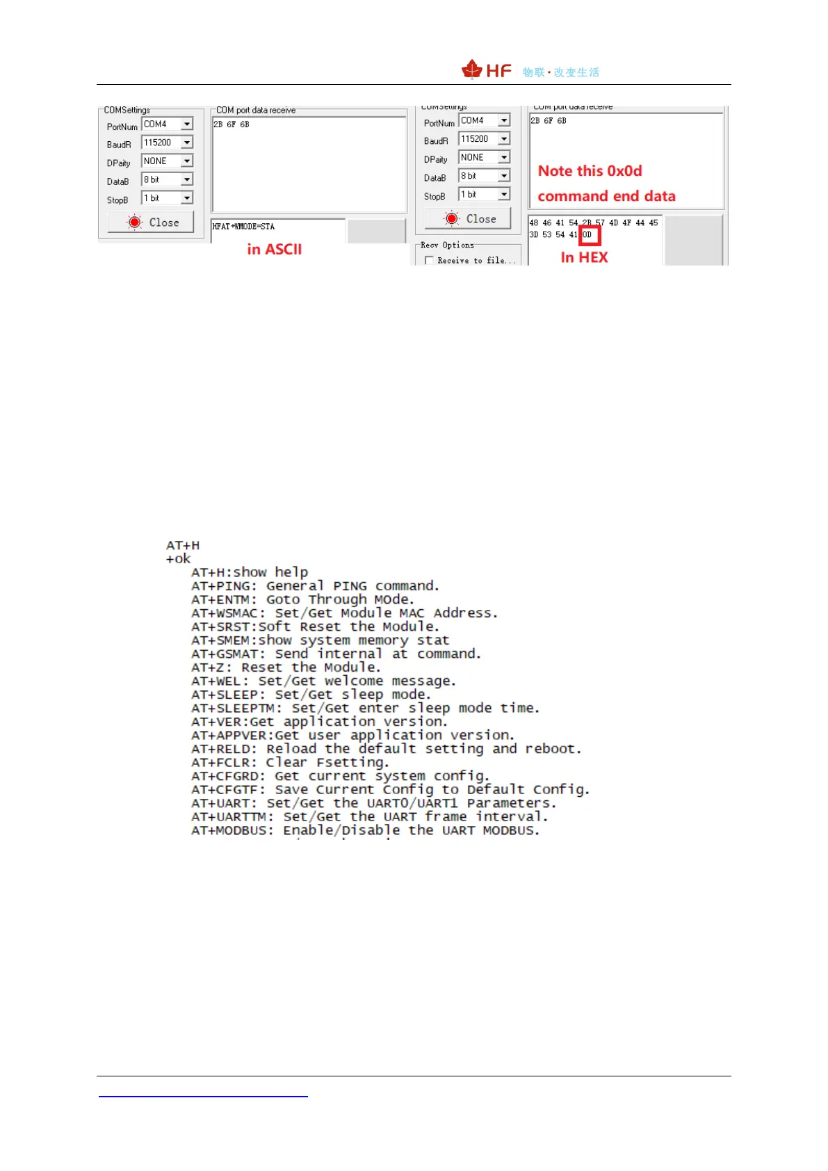 The AT+ command can be input directly through a serial port debugger such as a Hyper