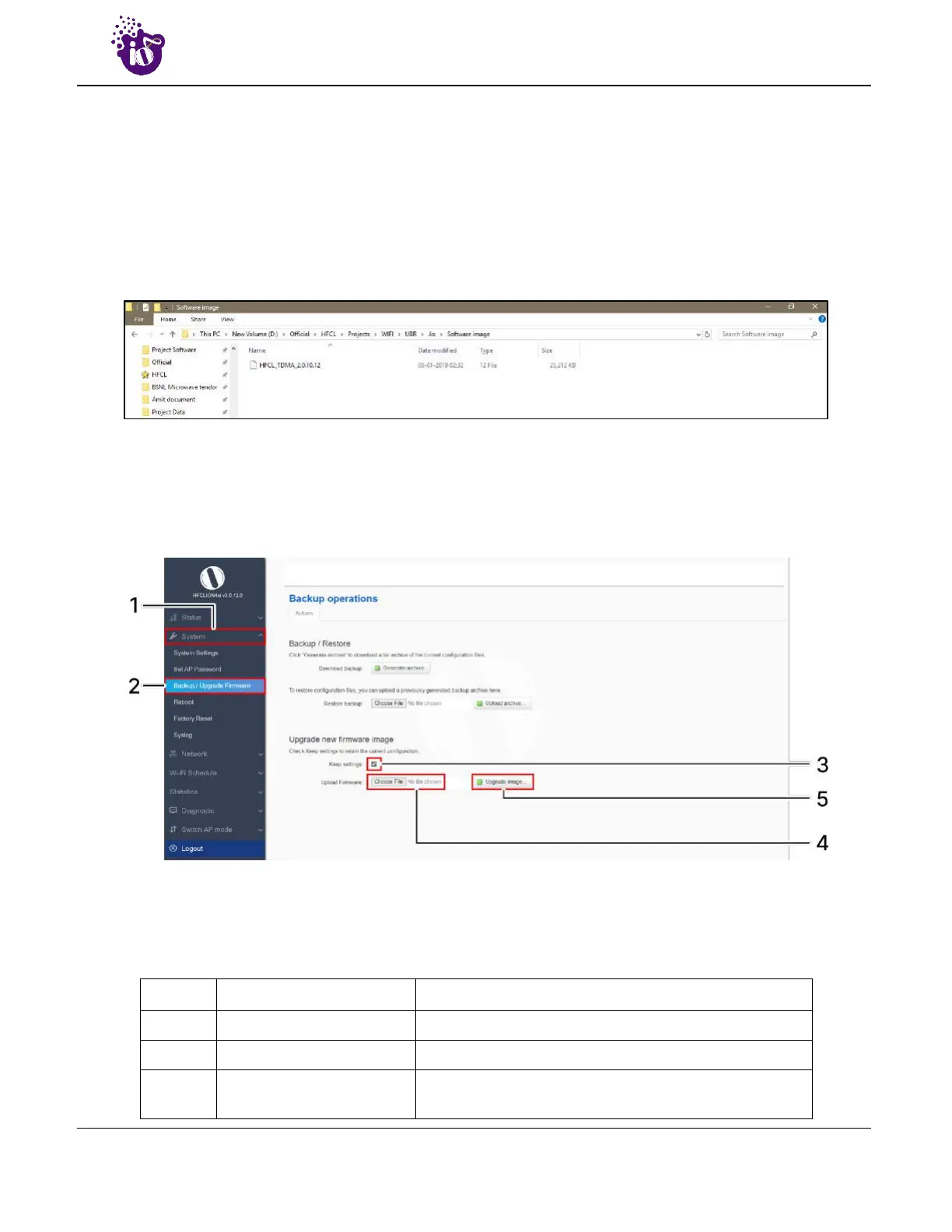 Table 14: List of actions to upgrade the firmware from an external file