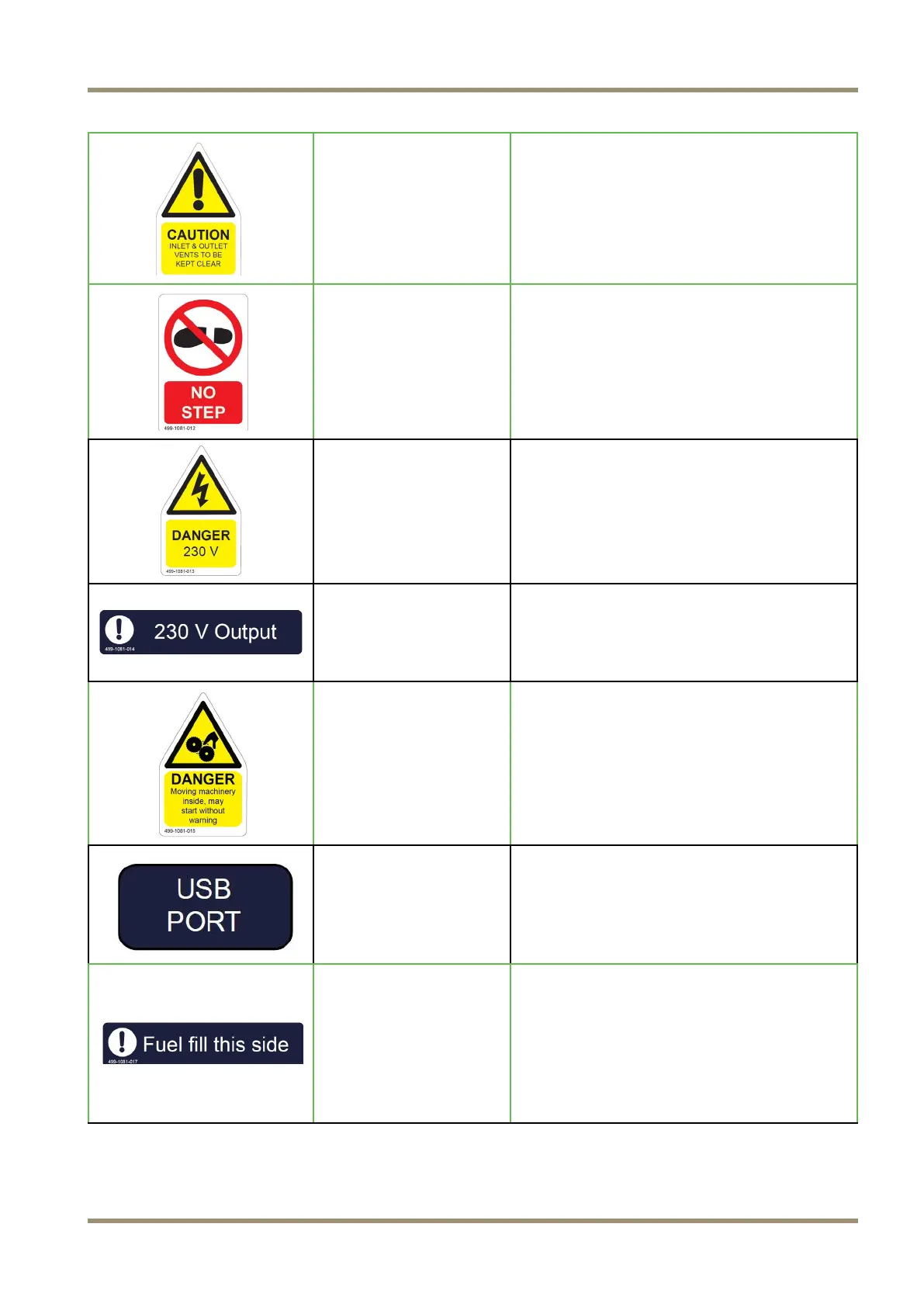 Advisory label showing voltage of the generator