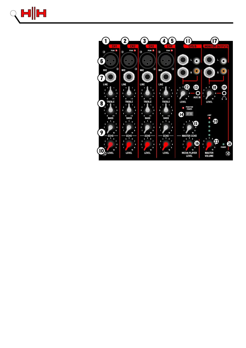 20. OUTPUT LEVEL METER: Use this to give an idea of the overall output level of your HH S2-210 system. If the