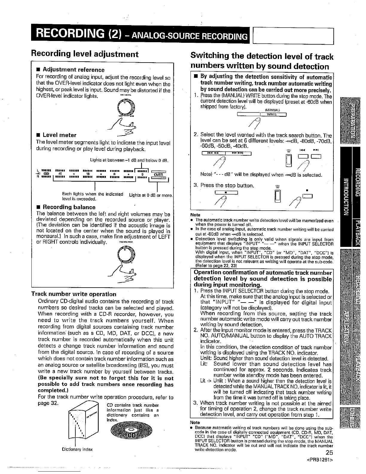 HHB CDR-800 - Recording level adjustment; Switching the detection level of track numbers written by sound detection; Track number write operation