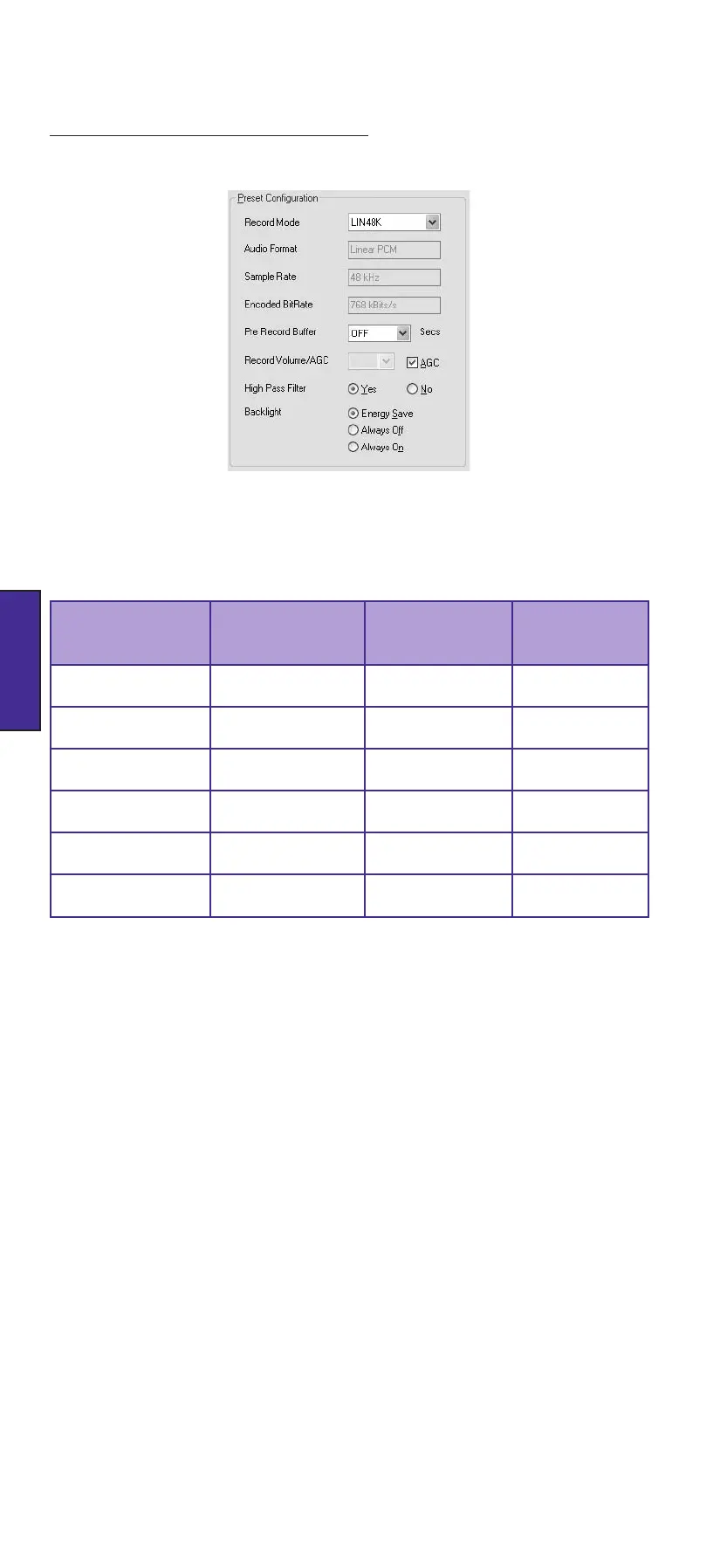 allant de zéro (off) à 10 secondes (réglée sur OFF dans l’exemple). Voir la section PreRecord