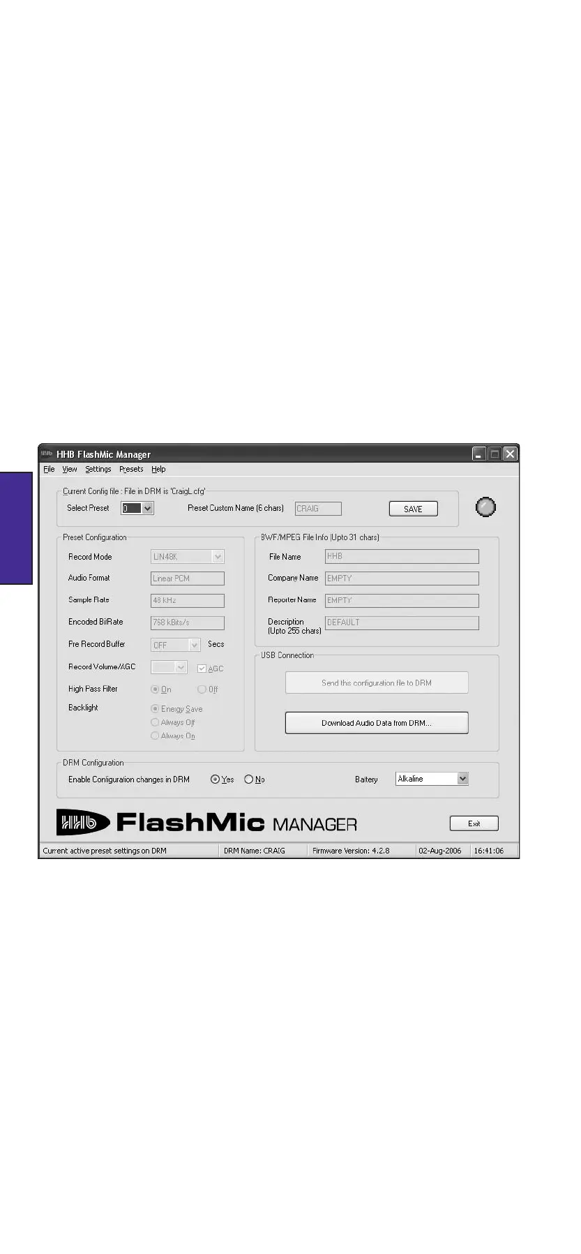 chargée dans le FlashMic, et le champ Select Preset est ramené à zéro. La barre d’état