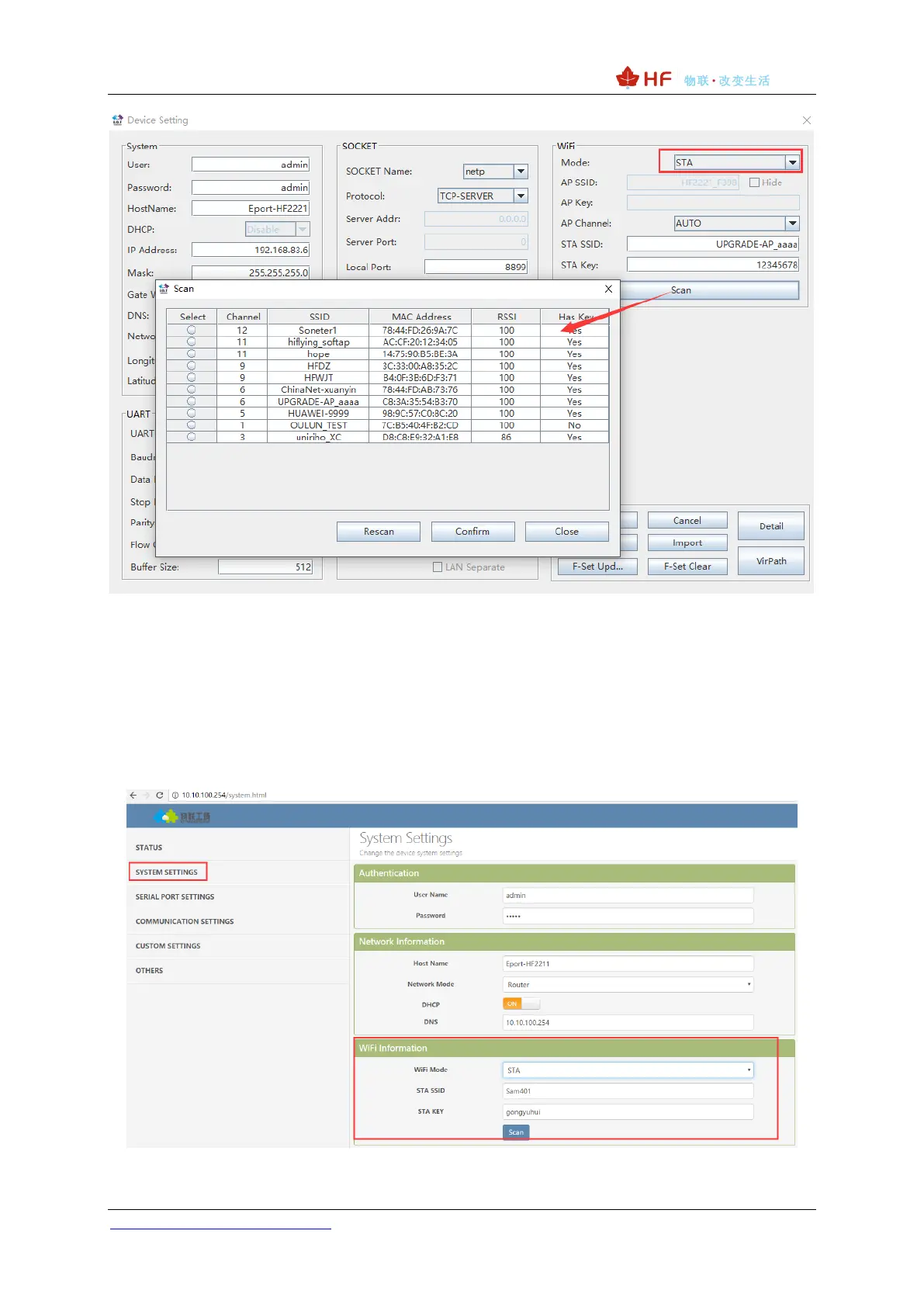 Use PC to connect with HF2221 through its AP SSID (IP:10.10.100.254) or PC and HF2221 connect