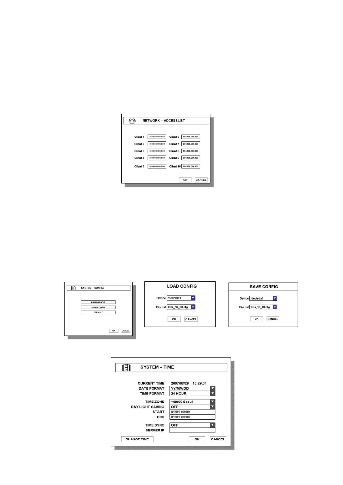 ● LOAD CONFIG – Load saved configuration file from USB device and input to product.