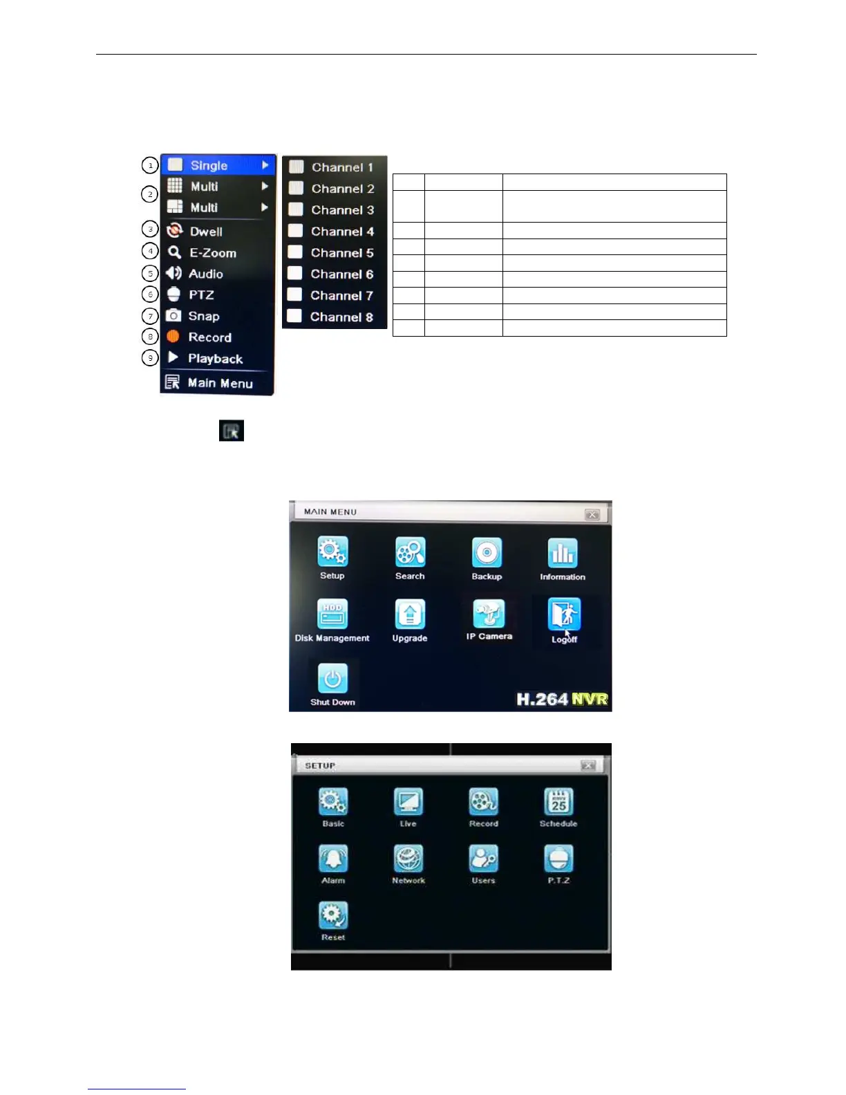 Click right mouse or press ESC button on the front panel, the control bar will display on the screen, refer to