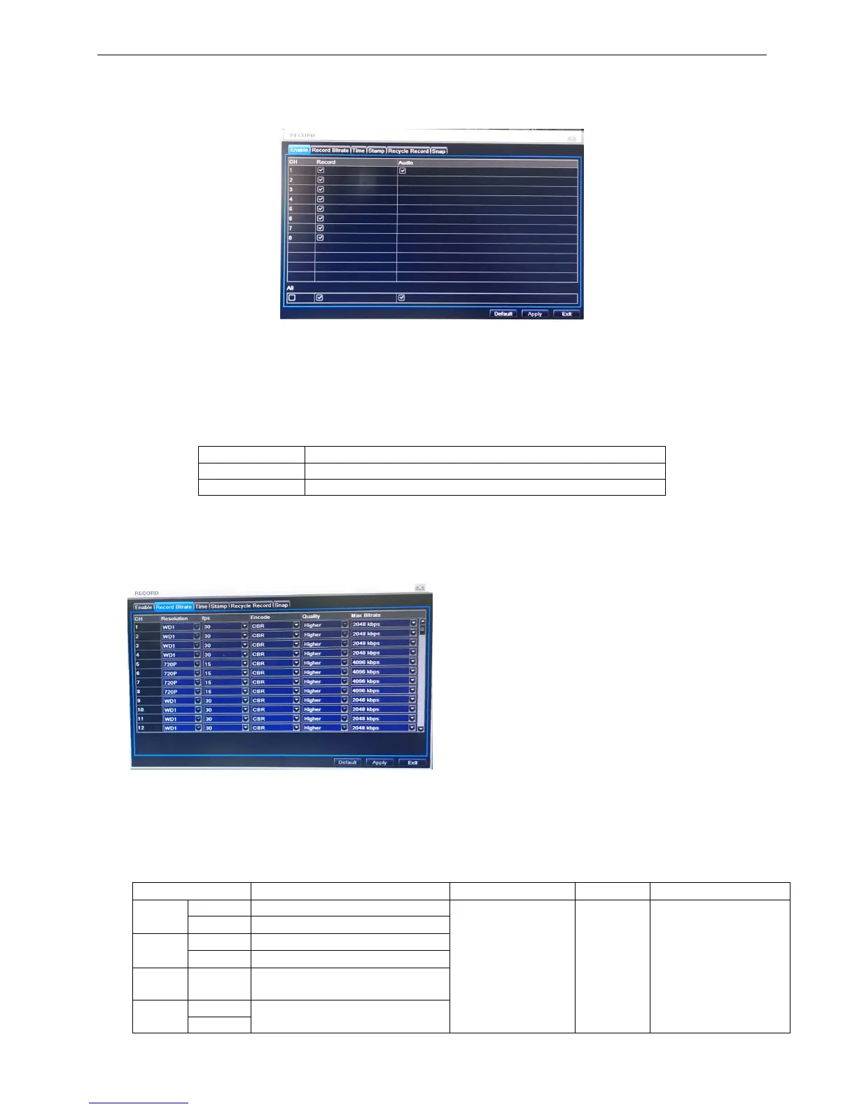 Record configuration includes five sub menus: enable, record bit rate, time, recycle record and stamp.