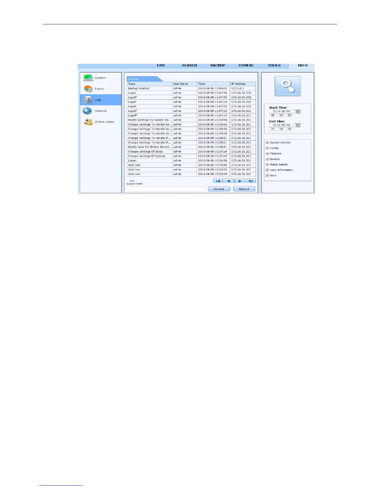 User can view information, such as username, IP address and so on. Enter into INFO→Log, user can set the