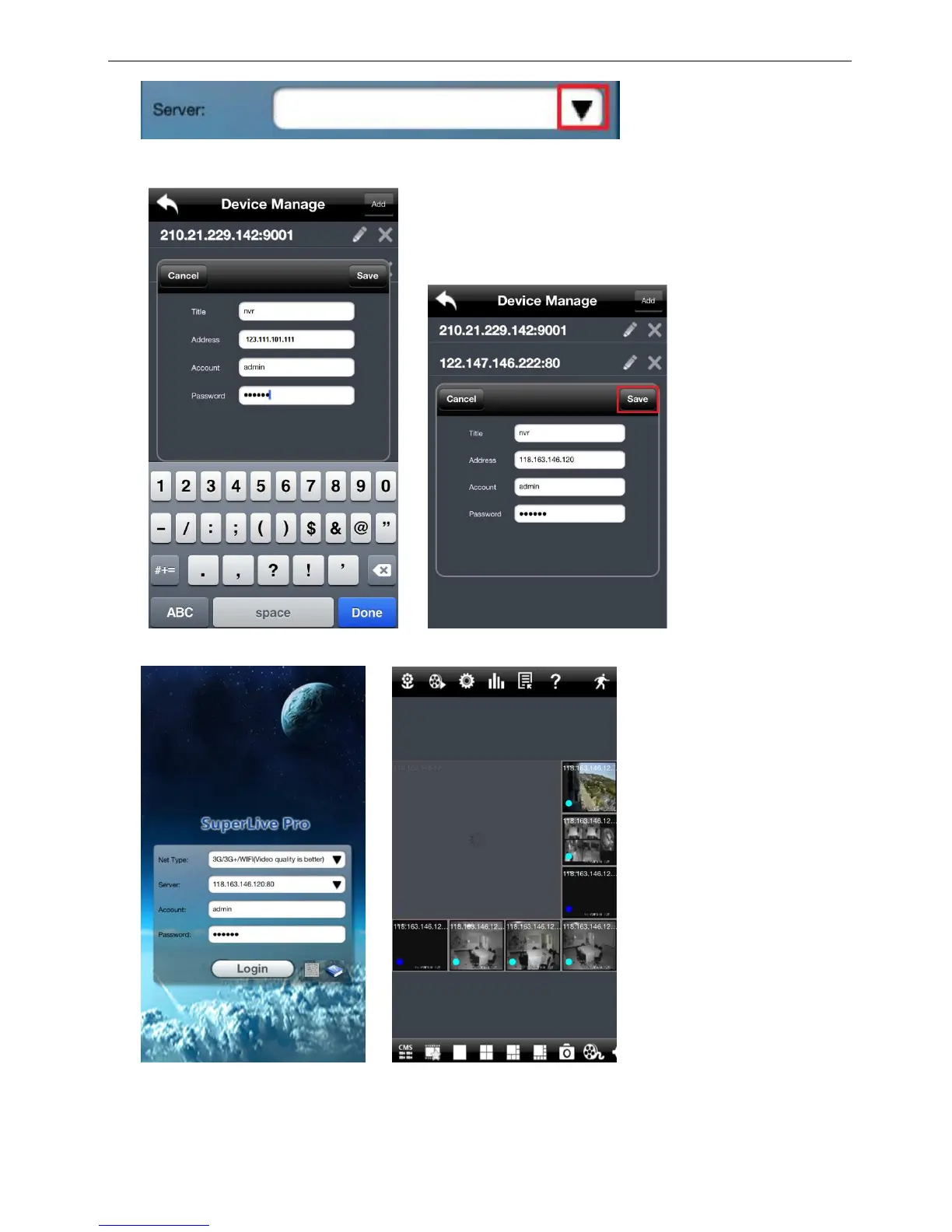 Key in the device title, address, username and password, then click on SAVE to save in the device manage list