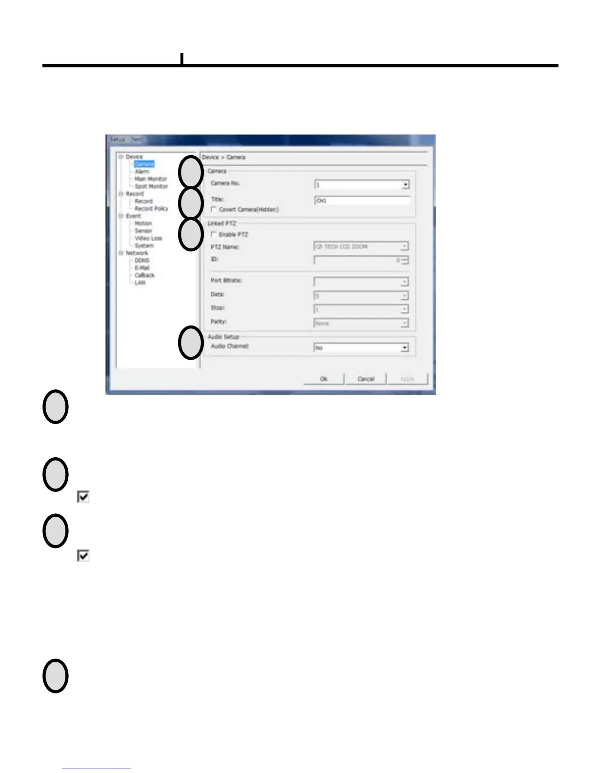 Audio : Item to select which audio channel to be used among total 4 audio inputs.