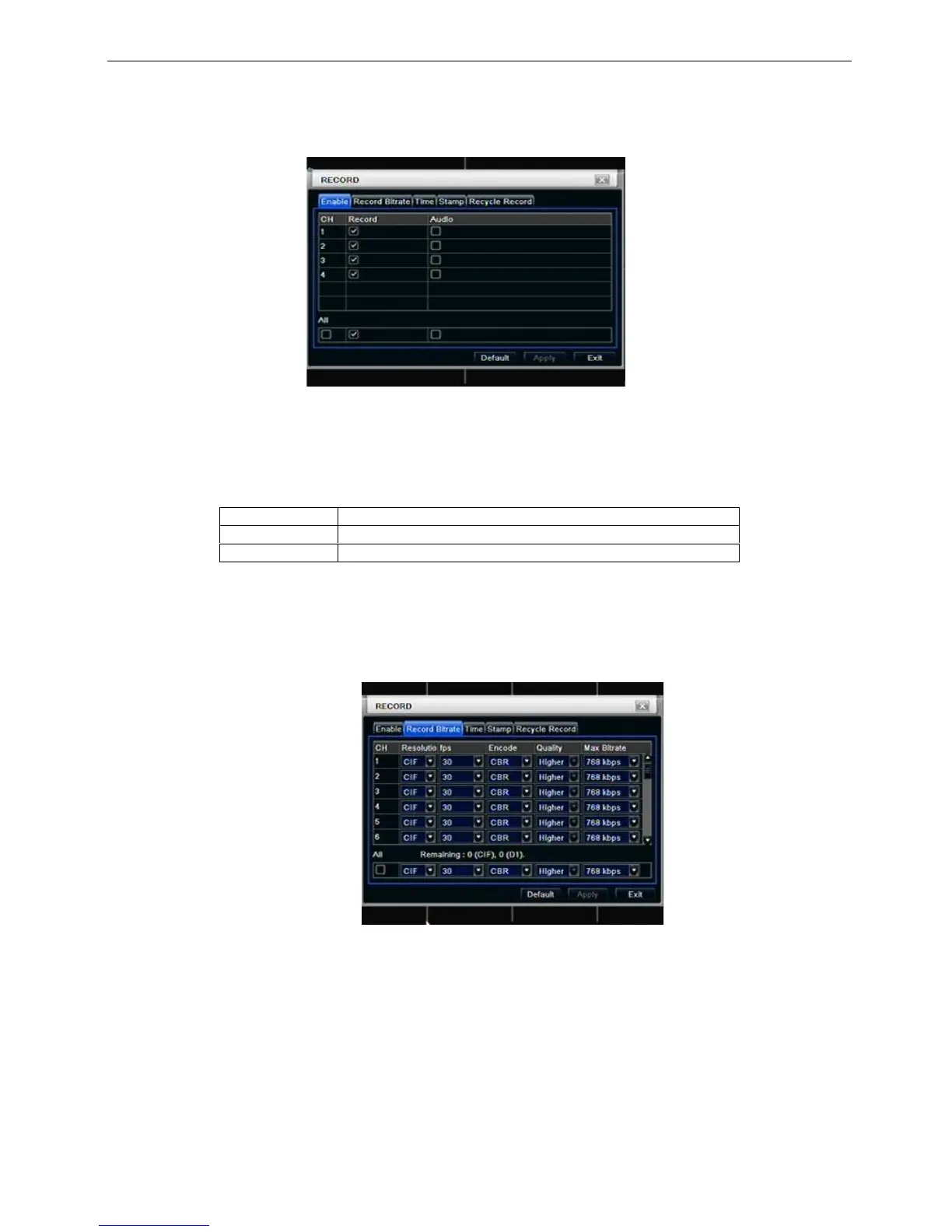 Record configuration includes five sub menus: enable, record bit rate, time, recycle record and stamp.