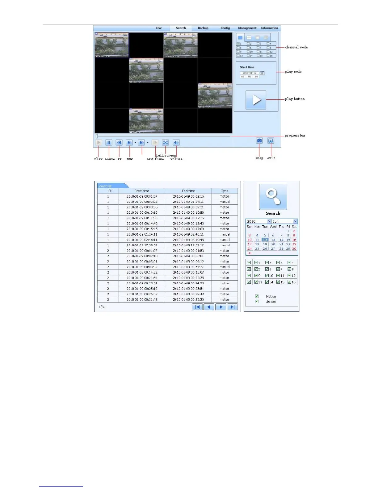 Step2: click the highlight date and select record channels and then tick off the event type: motion and sensor,