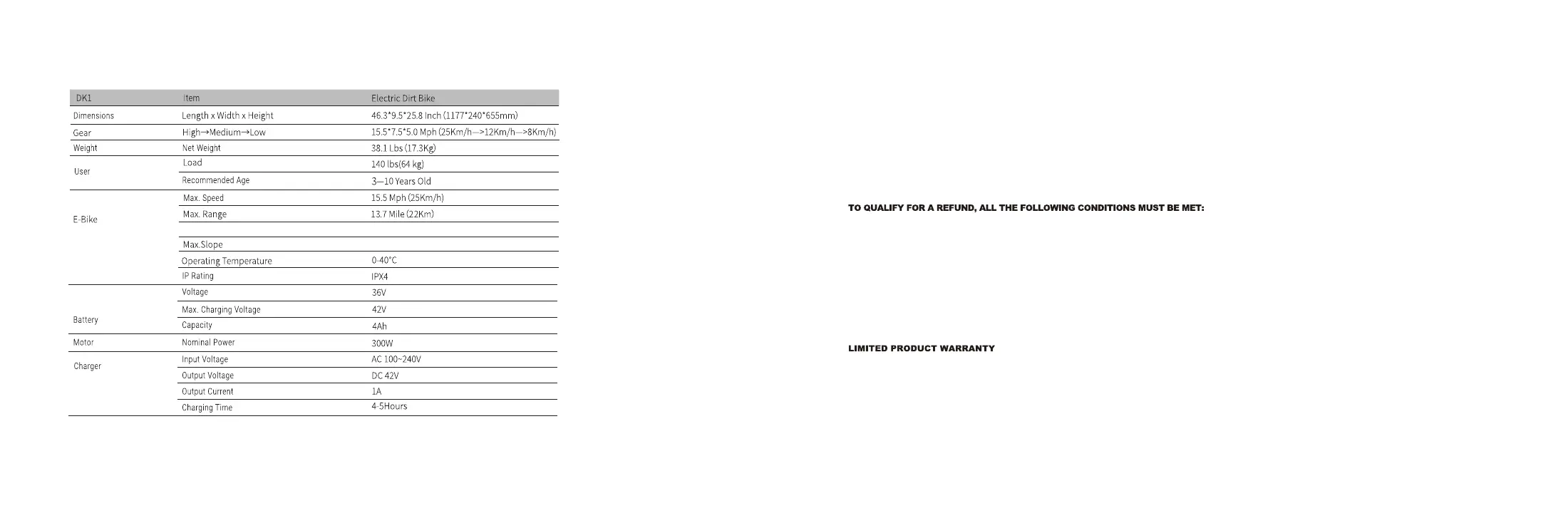 [2] Max. Range: measured when it is no wind and at 77°F, the dirt bike's fully charged to ride at a even speed of