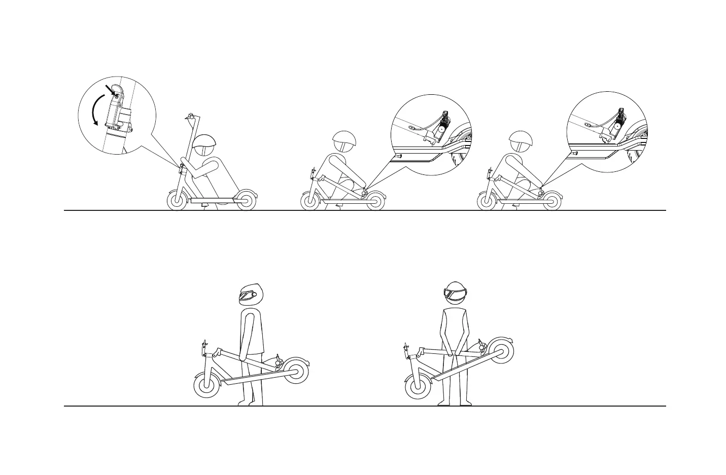 Make sure that the scooter’s turned off. To fold , unlock the latch and bend the lever, then, insert the buckle into the hole on the