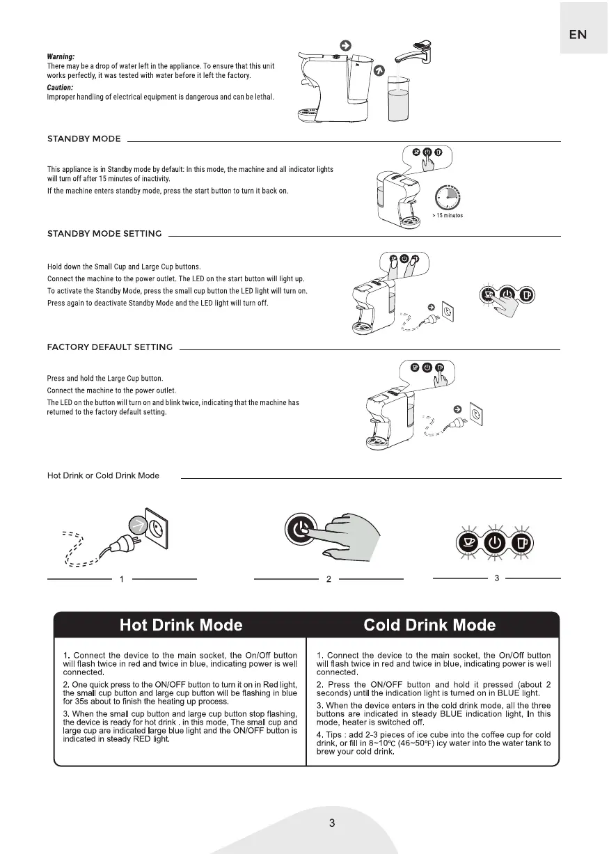 Toactivatethe StandbyMode,pressthe small cup button the LEDlight will turn on.