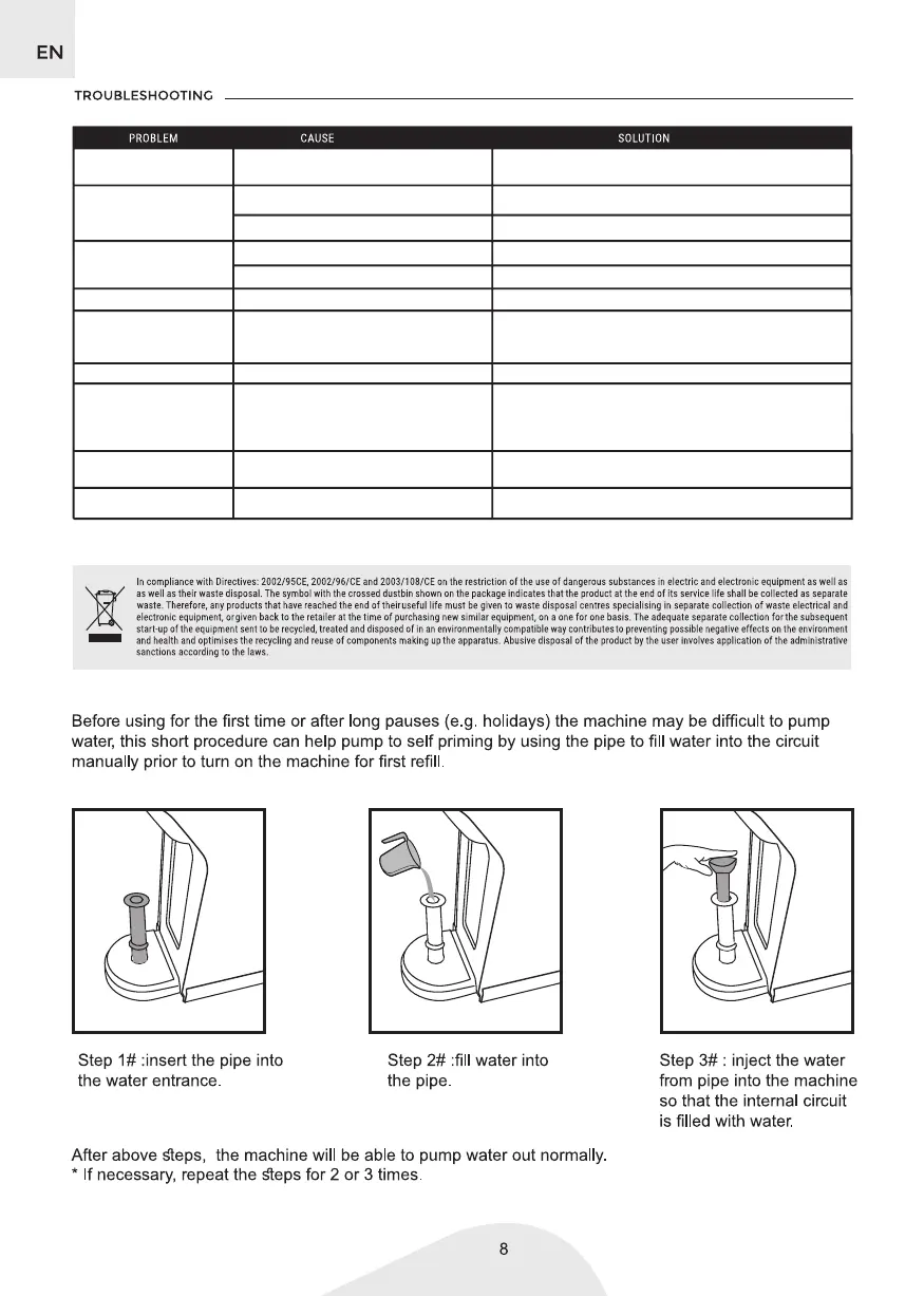 Before using for the first time or after long pauses (e.g. holidays) the machine may be difficult to pump