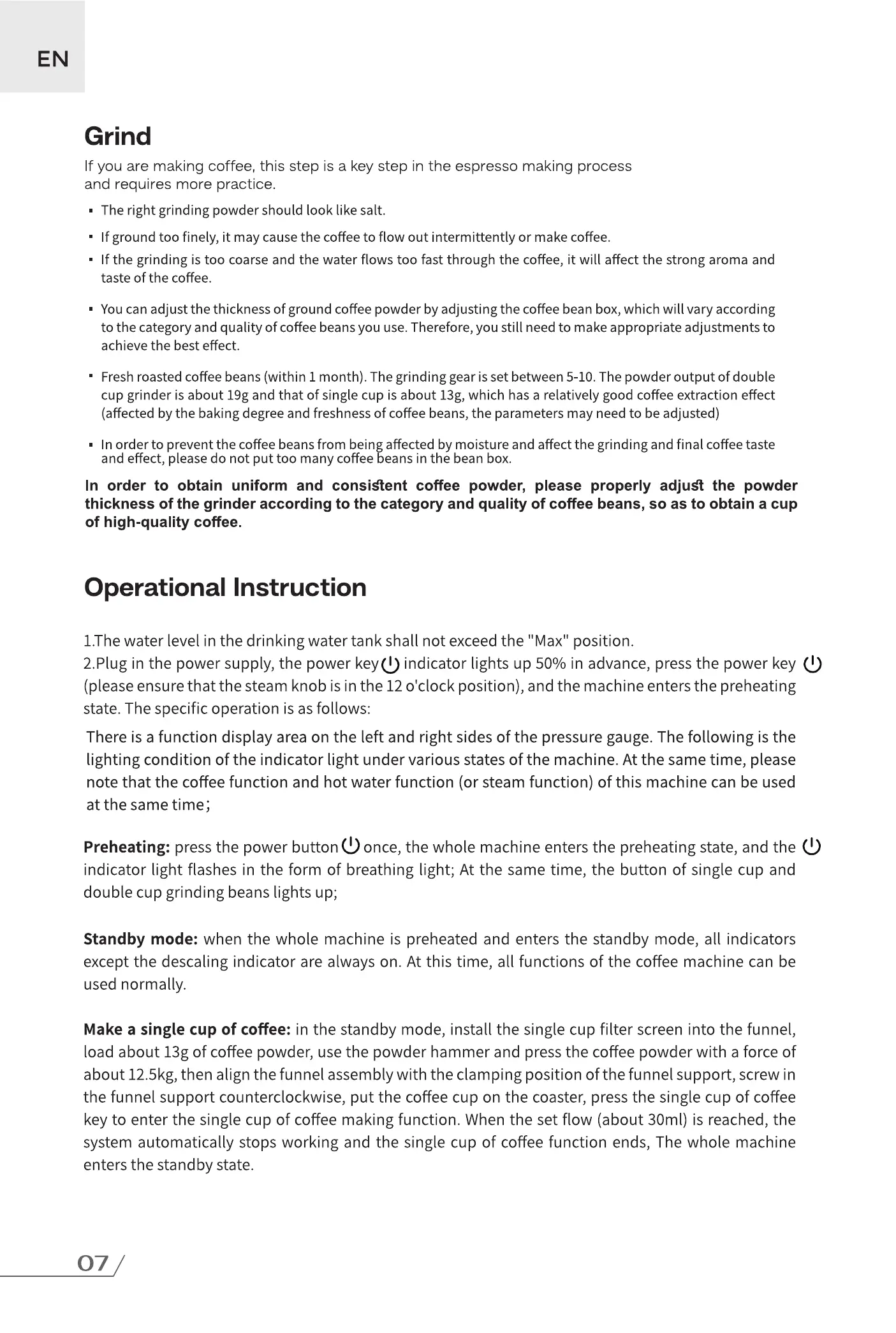 In order to obtain uniform and consiétent coffee powder, please properly adjugt the powder