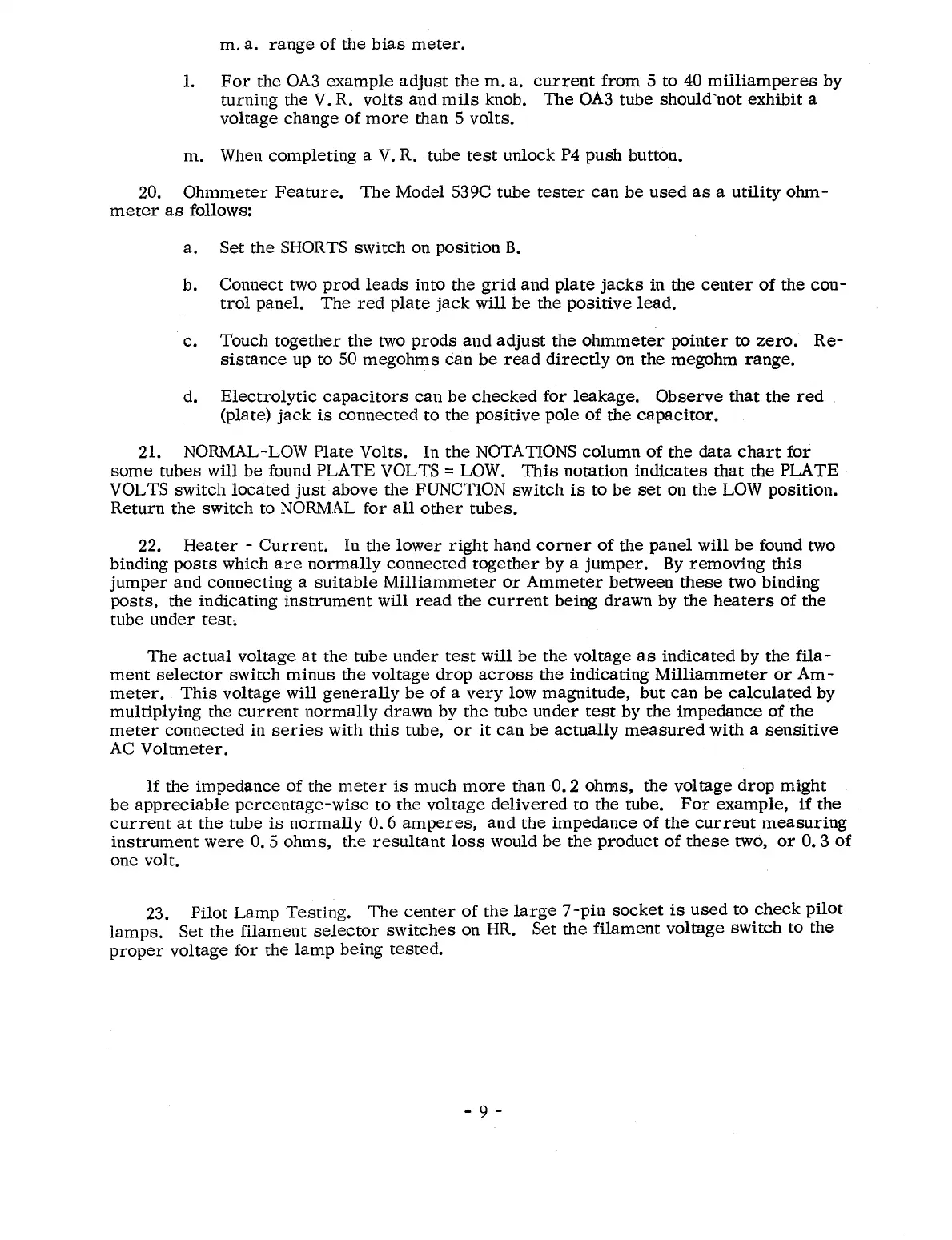 Hickok 539C - Meter Functions and Special Tests; Ohmmeter Functionality; Normal and Low Plate Voltage Settings; Heater Current Measurement
