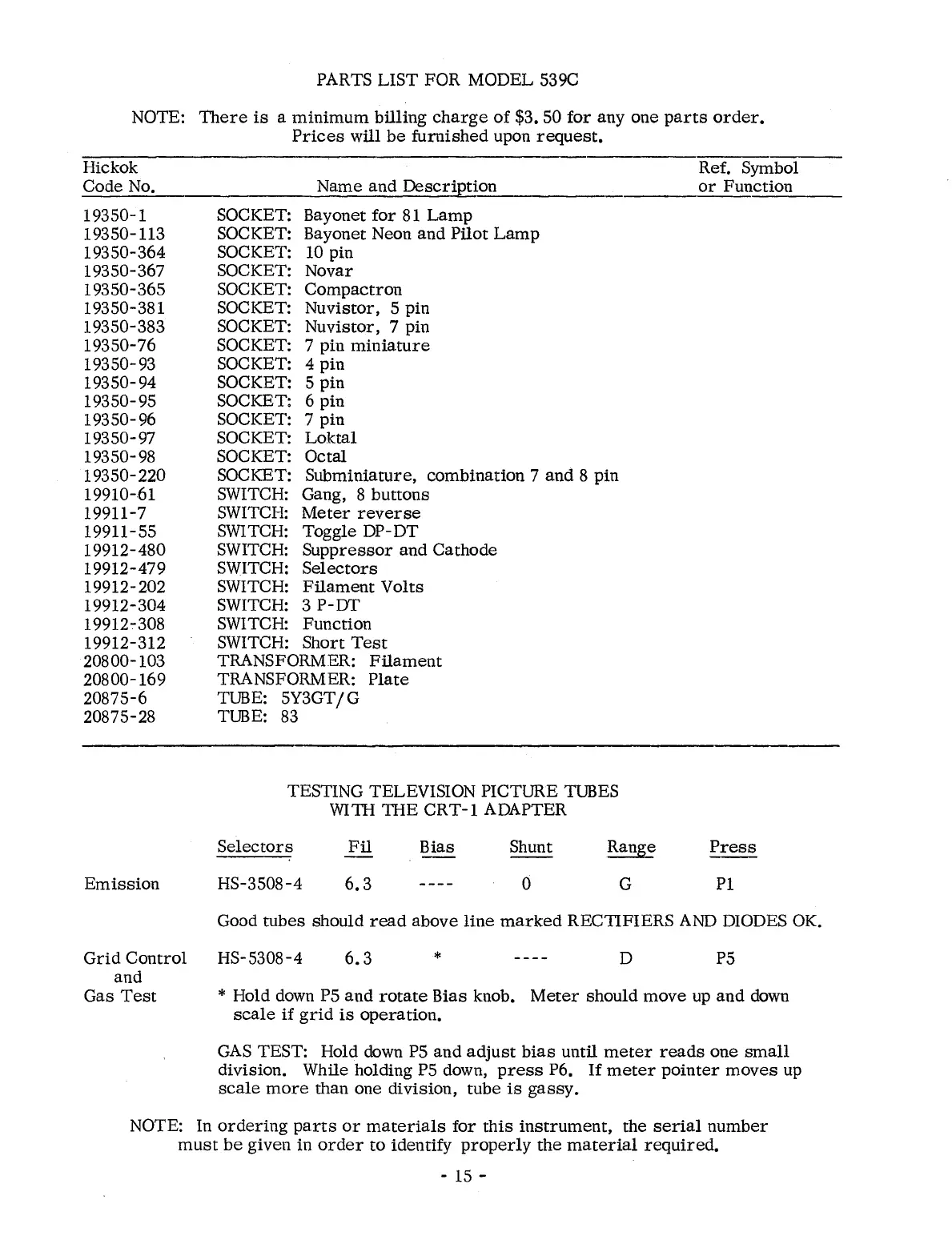 PARTS LIST FOR MODEL 539C
