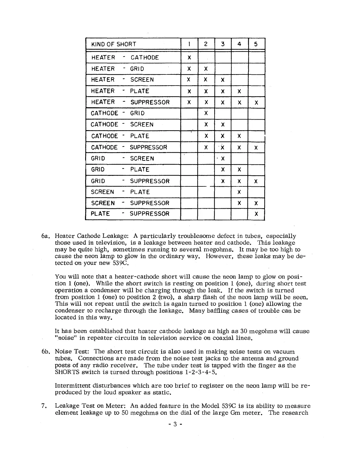 Hickok 539C - Further Control Functions and Tests; Heater Cathode Leakage Detection; Noise Test Procedure; Leakage Resistance Meter Test