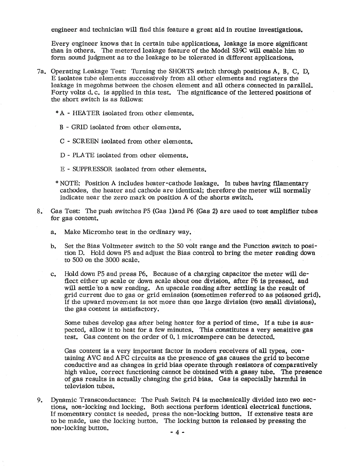 Hickok 539C - Tube Testing Procedures; Operating Leakage Test Procedure; Gas Content Testing; Dynamic Transconductance Testing
