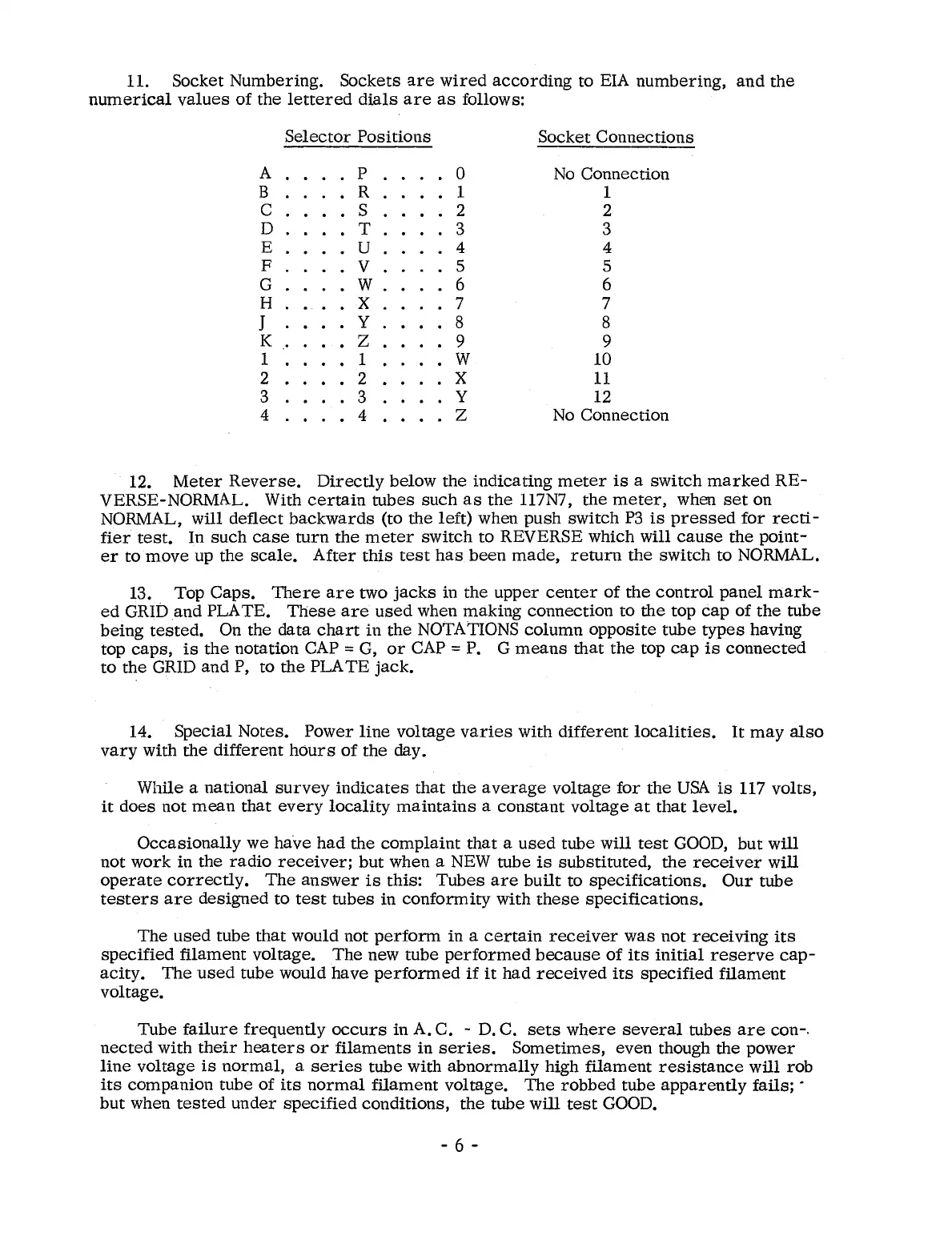Hickok 539C - Socket and Special Test Notes; Tube Socket Numbering and Connections; Meter Reverse Function; Top Cap Connections