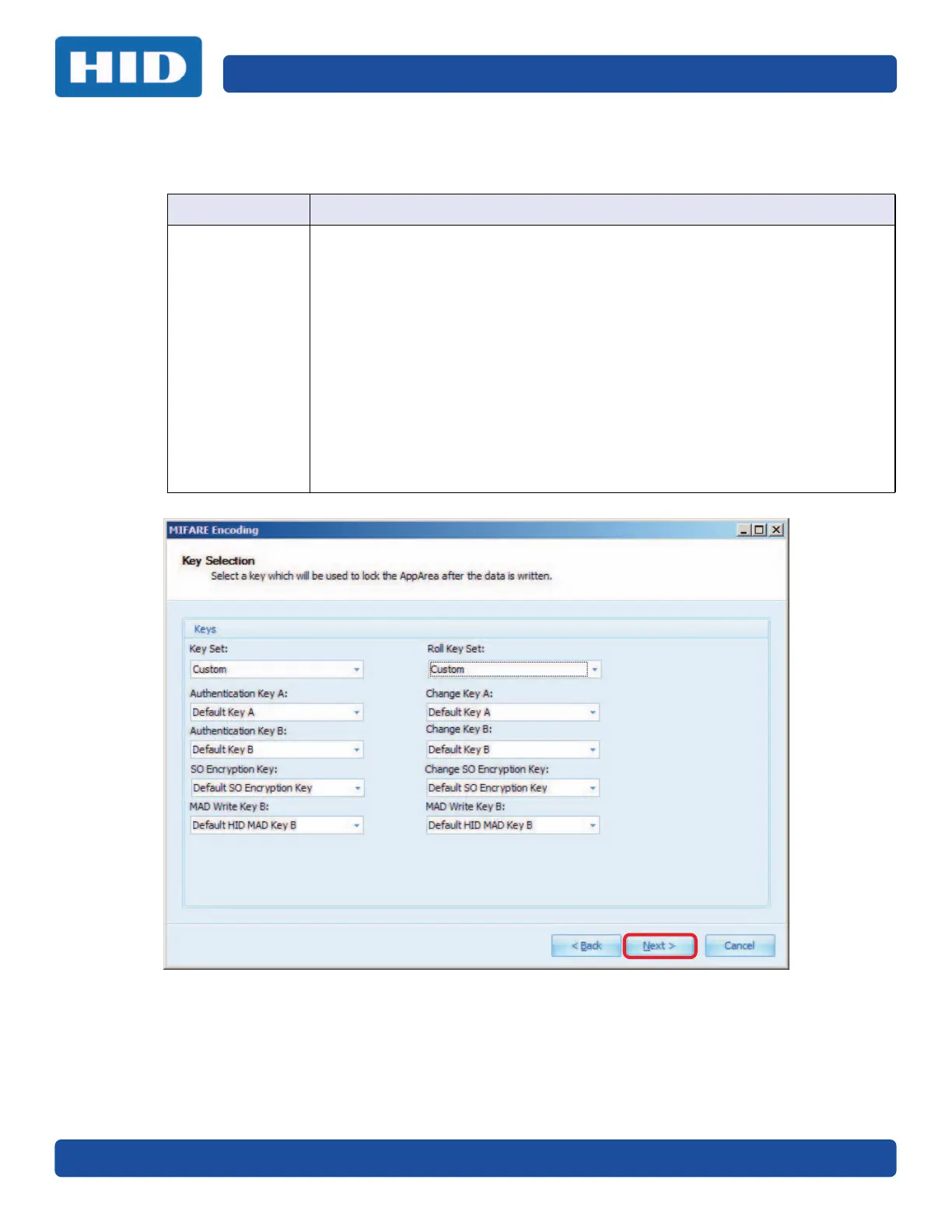 The following section is the Key Selection window for MIFARE Classic Encoding.