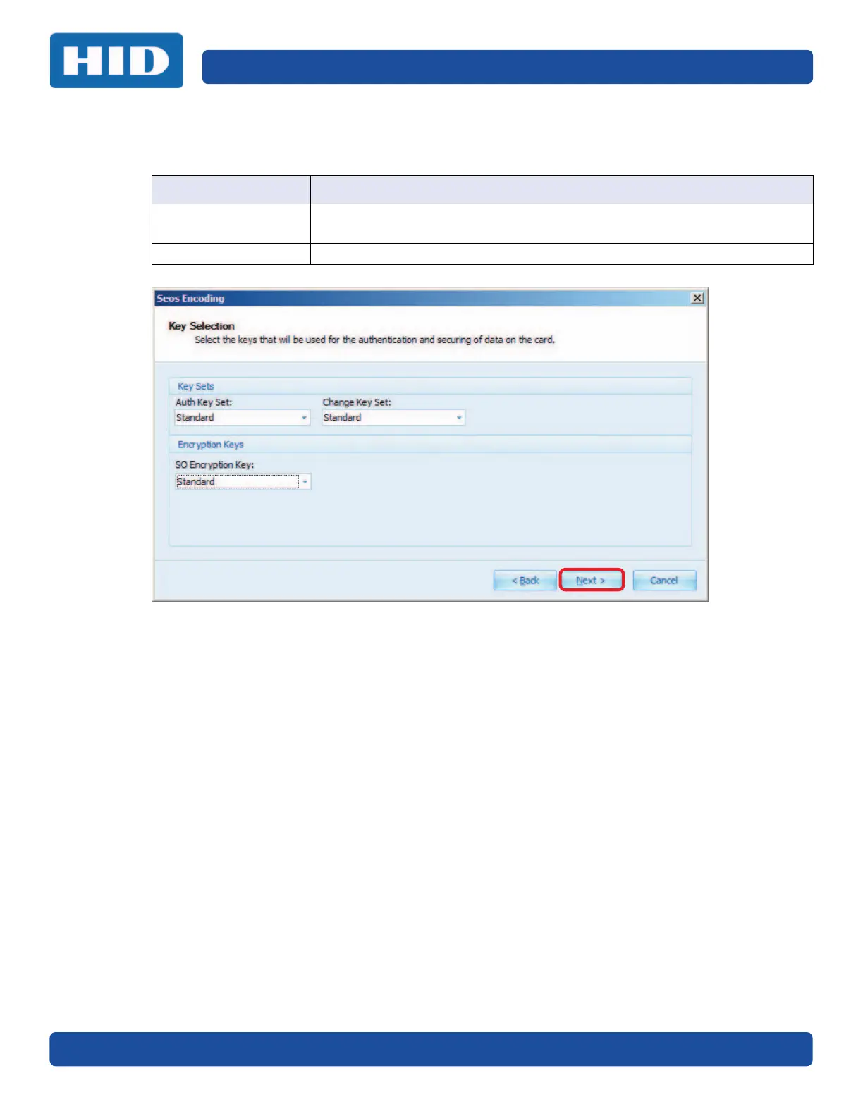 Encryption Keys SO Encryption Key: Standard or HID Standard Key Sets may be selected.