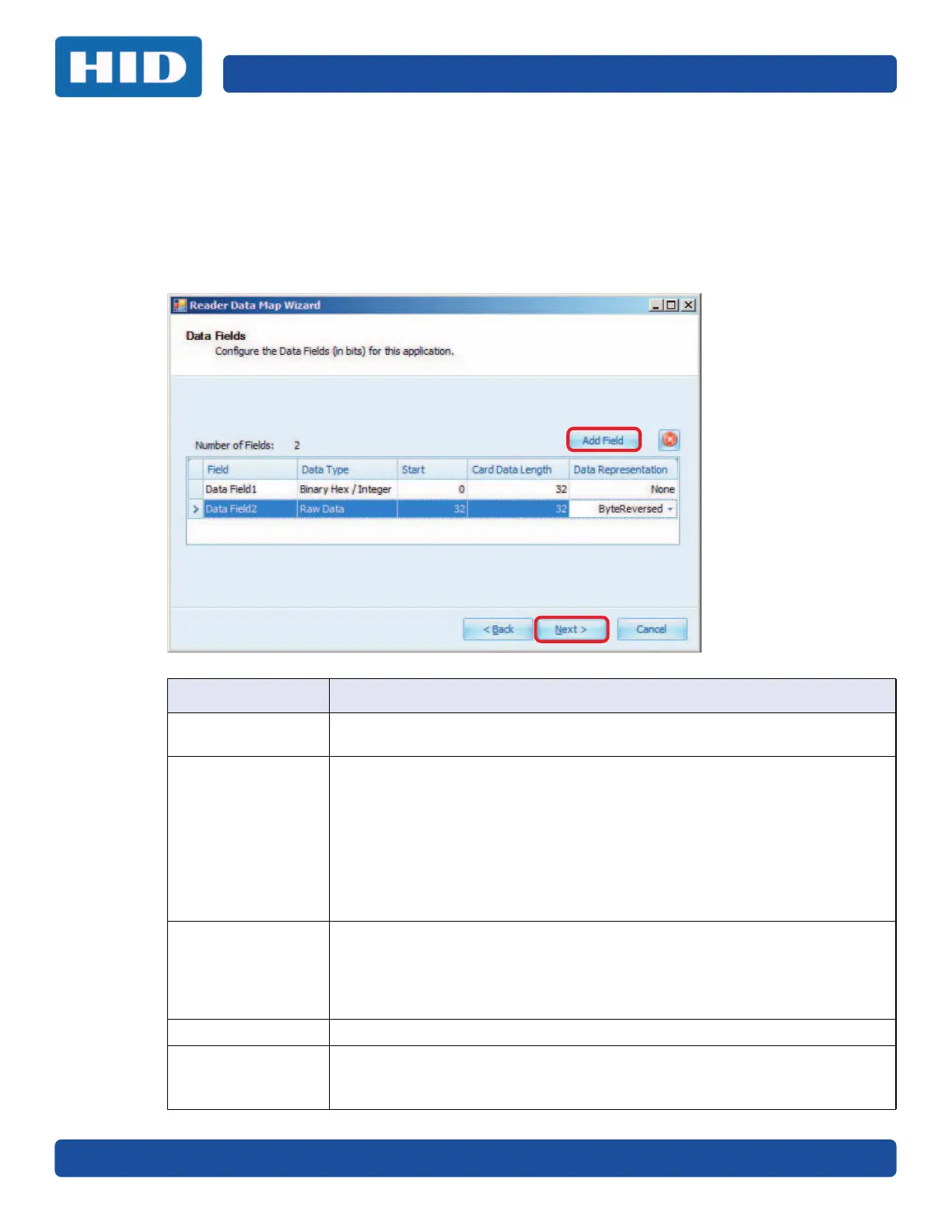 Field Names the Data Field and is auto-incremented when selecting Add Field. It is