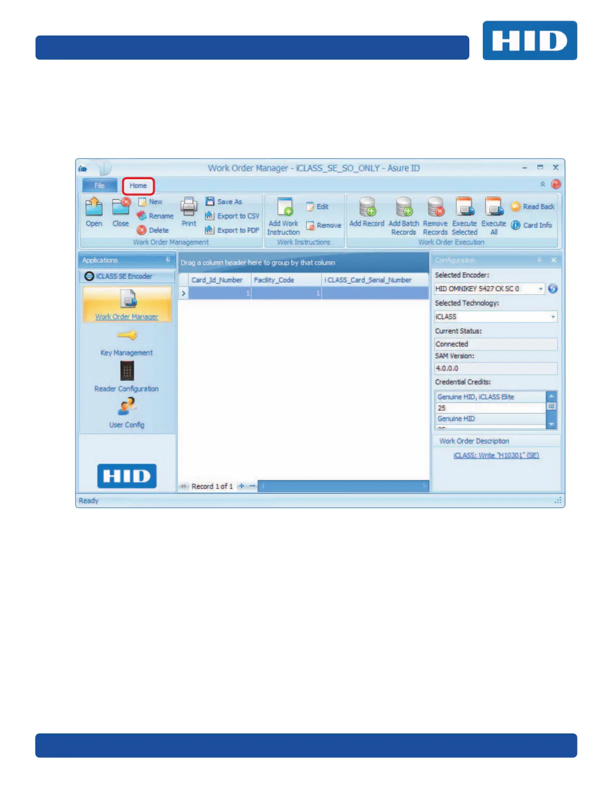 The Home tab allows configuration and implementation of the iCLASS SE Desktop Encoder. See the