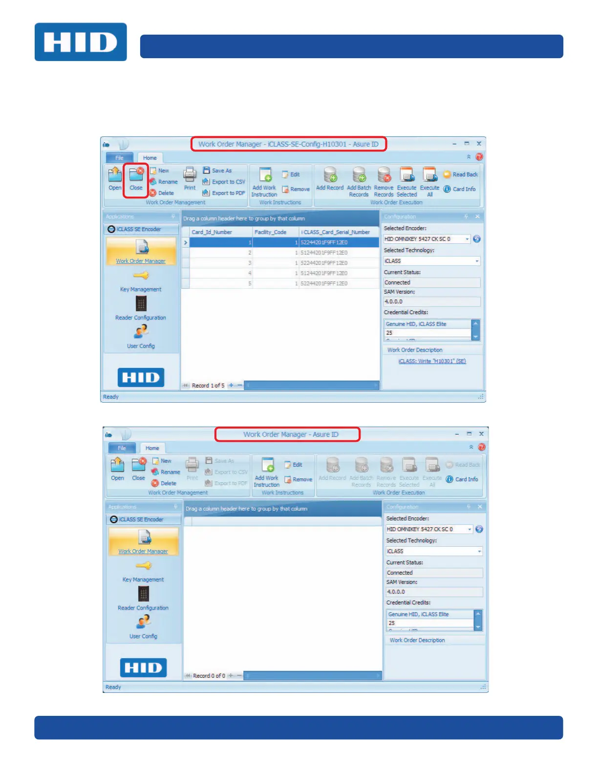 1. When a Work Order is Open, select Close from the toolbar. See Section 5.3: Open a Work