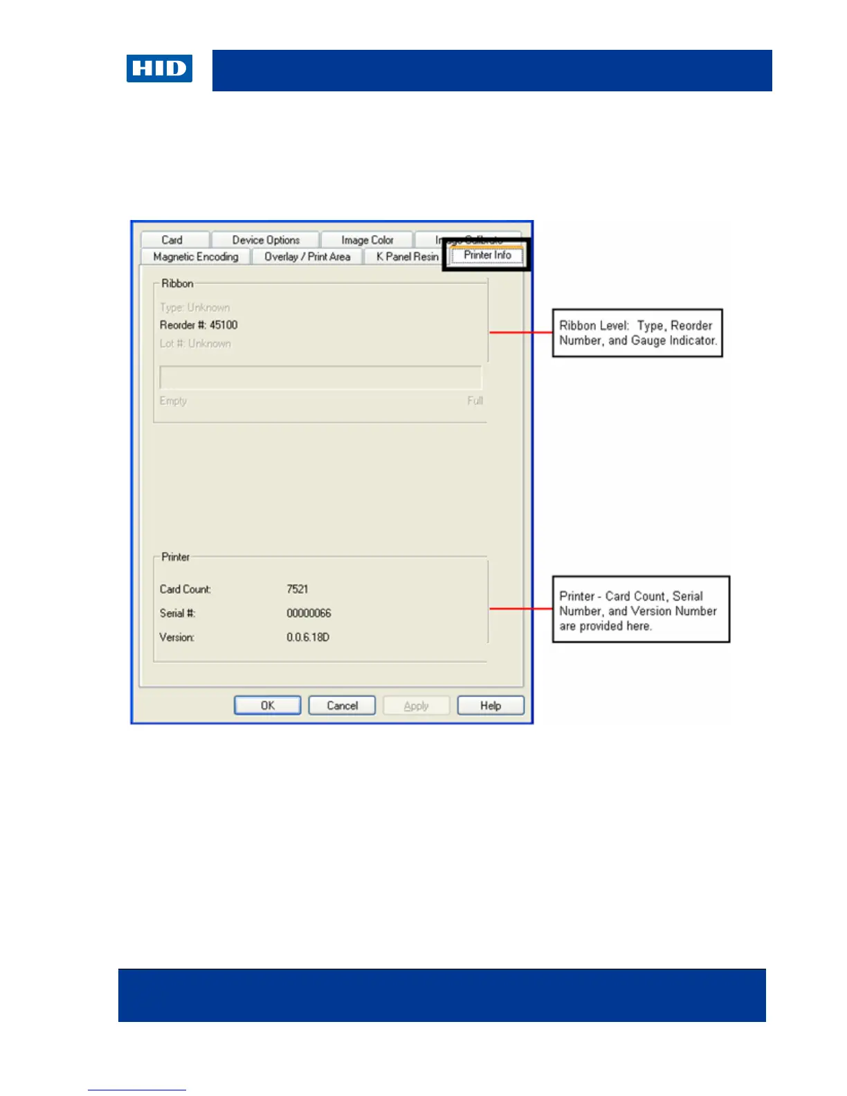 Use the options on this tab to view information about the Ribbon, Card Count, Printer Serial #,