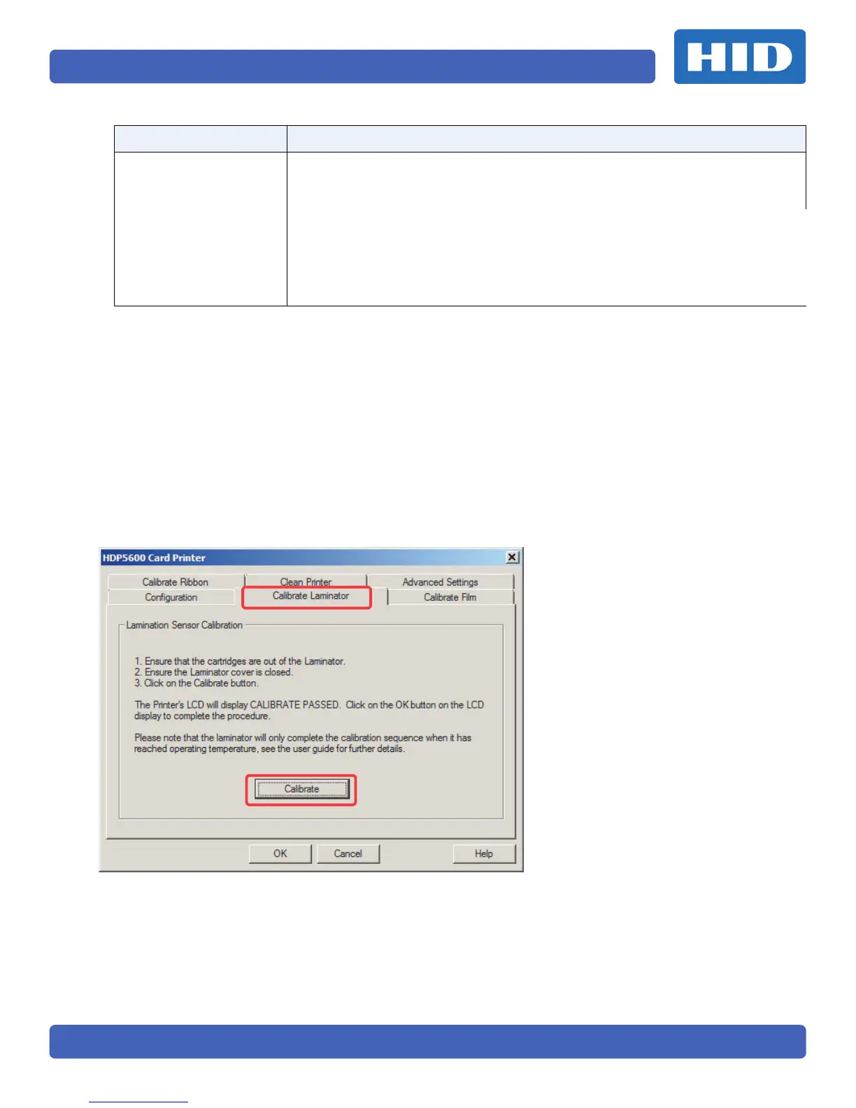 The Calibrate Laminator option sends the calibrate laminator command to printer. Follow