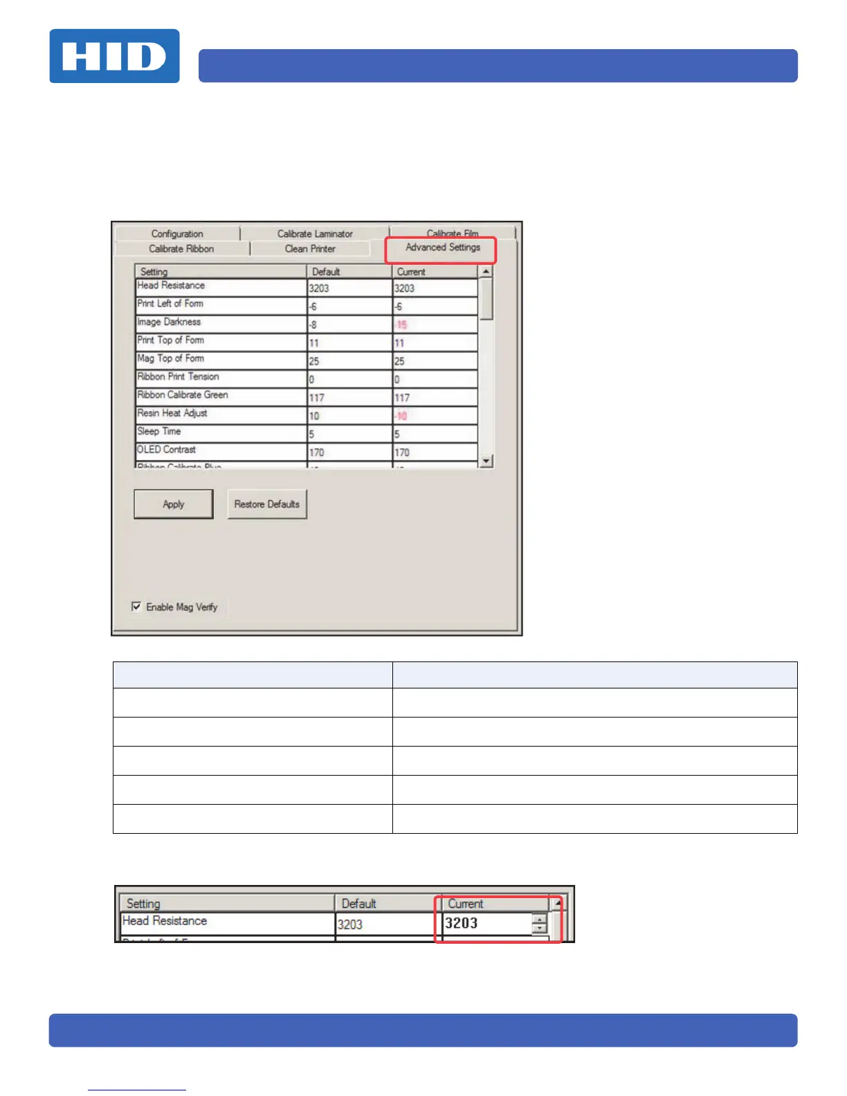 Current This column displays current value for setting.