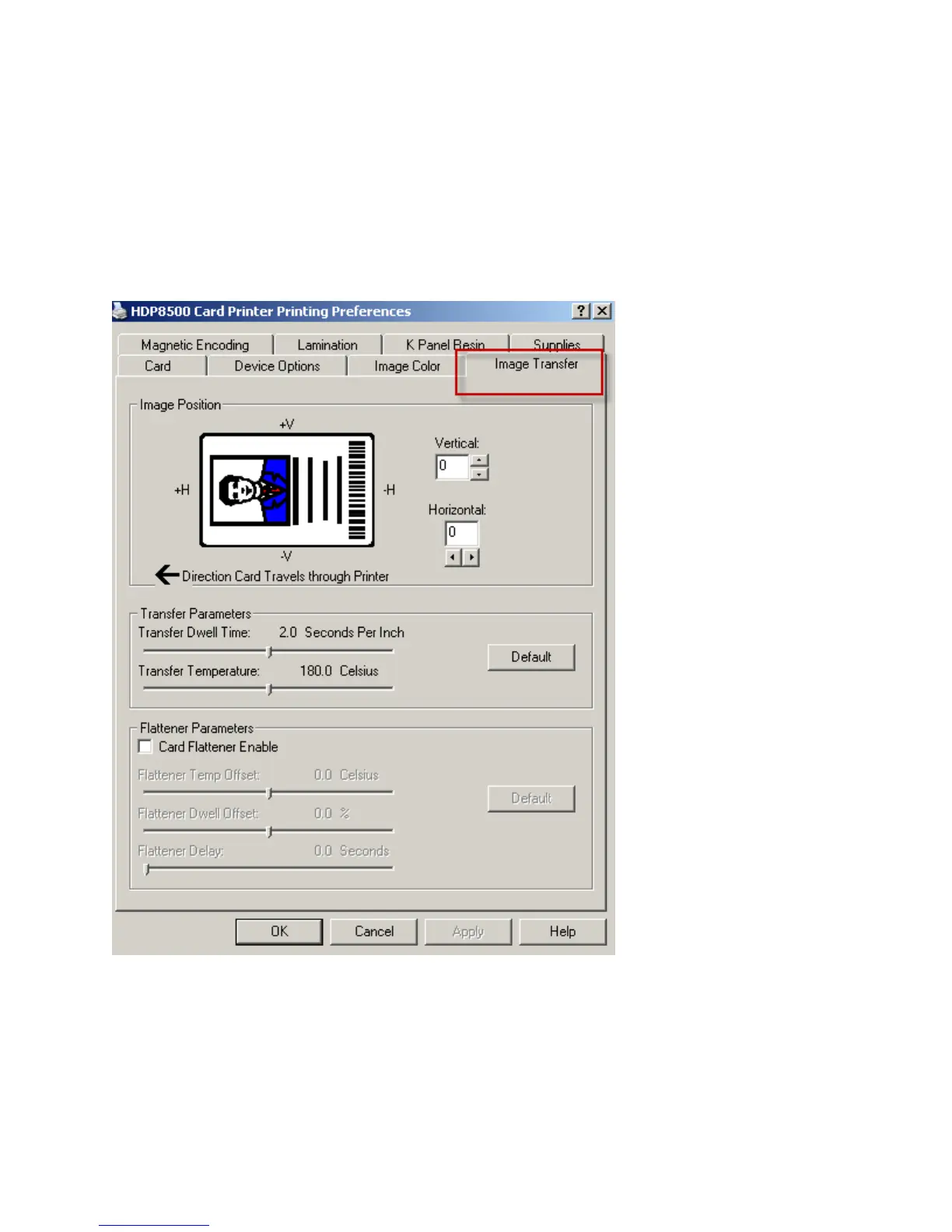 Use this tab to adjust the Image Position, Transfer Dwell Time and Transfer Temperature.
