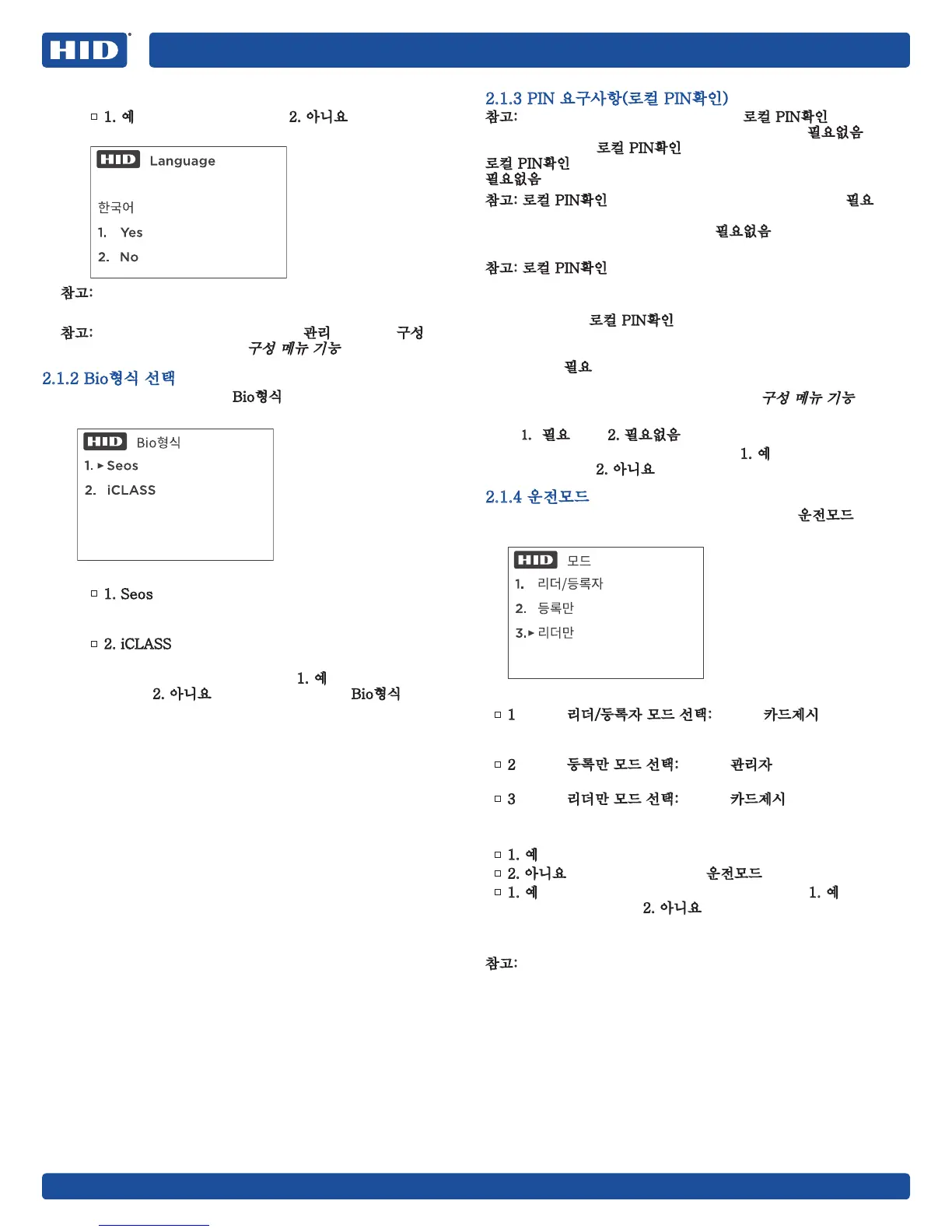 참고: PIN 필요 항목은 리더를 주문할 때 로컬 PIN확인 공장