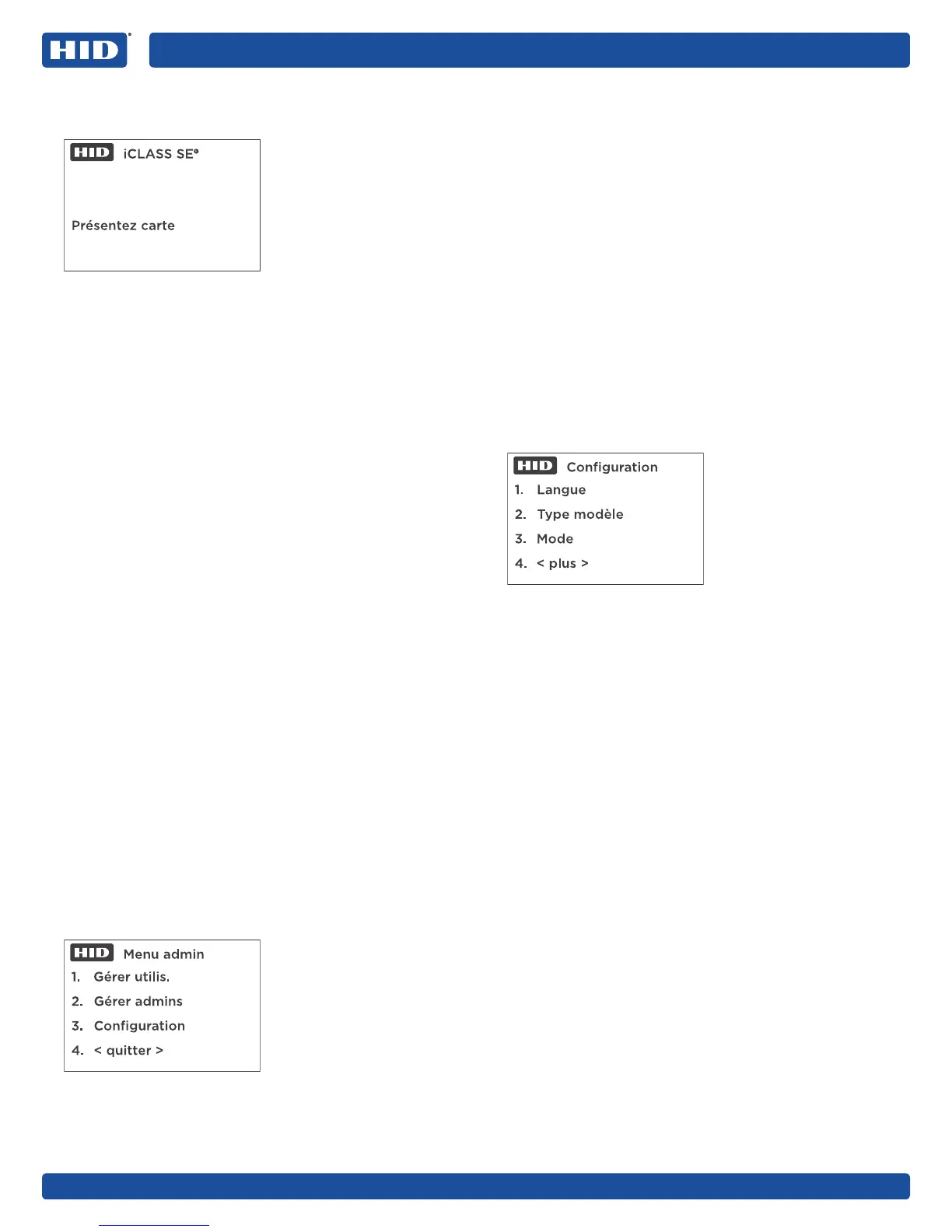 configuré pour des cartes iCLASS ou iCLASS SR, les menus
