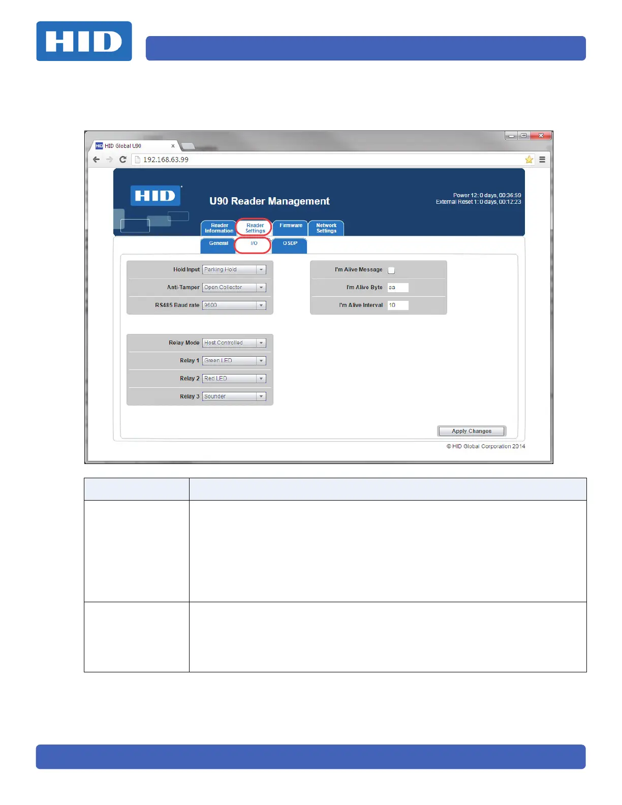 The I/O tab is used for optional settings such as anti-tamper, external relays, and I’m alive signal.