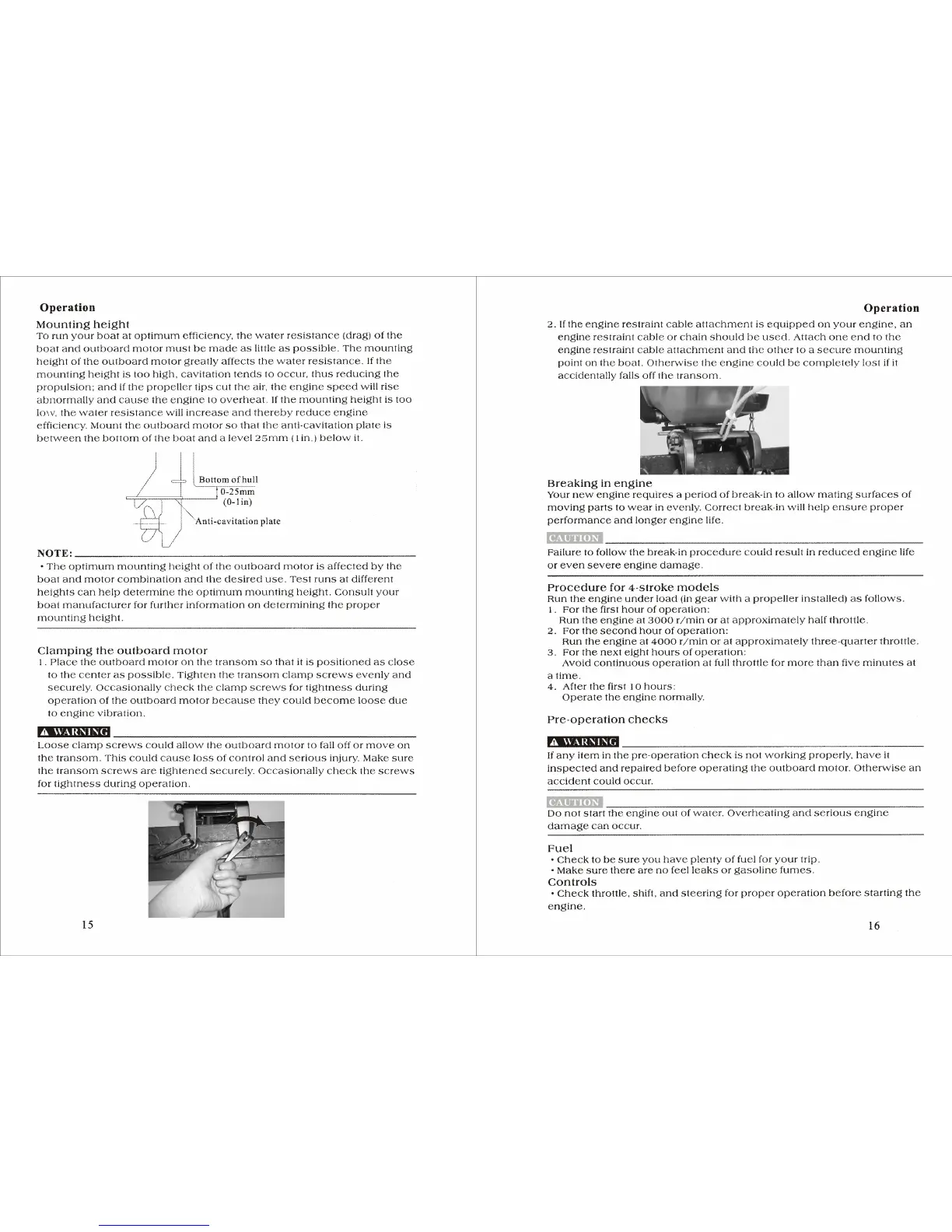 Hidea F5 - Mounting Height; Clamping the Outboard Motor; Breaking in Engine; Procedure for 4-Stroke Models