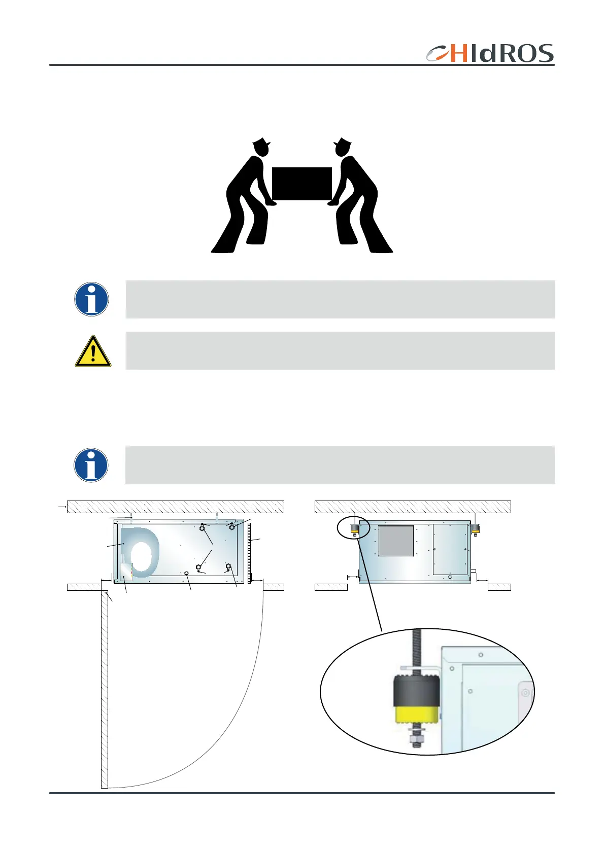 In the below drawing, the typical ceiling installation is shown (typical for residential buildings, offices etc.) where the unit is hanging thanks